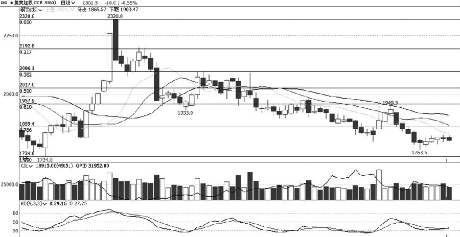从PTA加权日线走势图可以看出,该品种二次探底结束后,再次展开反弹,于12月16日以大阳线的形式有效突破了下降通道,但是冲高后,强势未延续,而是震荡回落调整。昨日更是以低开中阴线冲击均线系统,同时均线系统也由空头排列转为多头排列,虽然走势有回坐趋势线的倾向,但是在跌破前期低点之前,仍有走高可能。 焦炭 弱势反弹