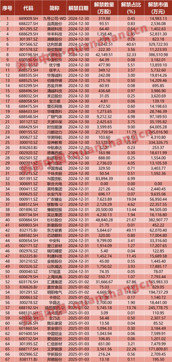 证监会拟“打包”修改或废止89件规章、规范性文件 根据中国证监会12月27日发布的消息,新公司法实施后,证监会对现行证券期货制度规则开展配套规则修改完善工作,现就配套制度规则中拟集中“打包”修改、废止的89件规章、规范性文件以及《上市公司章程指引(修订草案征求意见稿)》(下称“章程指引”)和《上市公司股东会规则(修订草案征求意见稿)》(下称“股东会规则”)2件规则向社会公开征求意见。 本次拟修改规章21件、规范性文件66件,废止规范性文件2件。同时,为引导申请首次公开发行股票并上市企业、申请公开发行股票并在北京证券交易所上市的企业(以下统称“申请首发上市的企业”)、上市公司、证券基金期货经营机构稳妥有序做好内部监督机构调整,证监会发布了过渡期安排,为市场参与主体预留了一年左右的时间。 交易所减半收取或免收手续费! 为进一步降低产业企业参与期货市场成本,更好服务实体经济高质量发展,12月27日盘后,广州期货交易所、大连商品交易所、郑州商品交易所、上海期货交易所(含上海国际能源交易中心)、中国金融期货交易所等国内5家期货交易所均推出2025年降费措施,包括套期保值交易手续费减半收取、免收标准仓单作为保证金手续费等内容。 同时,沪深交易所也表示,免收上市公司2025年上市初费和上市年费。免收沪市存量及增量上市公司2025年上市初费和上市年费。免收深市上市公司2025年度的上市初费和上市年费。自2025年7月1日起至2026年6月30日,上交所将交易单元使用费收费标准由原每个交易单元每年4.5万元下调至每个交易单元每年3万元,计费期间、减免政策和计算方式保持不变。 国家发改委新部门,亮相! 近日,“低空经济发展司”(简称“低空司”)作为内设机构已纳入国家发展改革委的机构设置中。低空司在“司局致辞”一栏中指出,发展低空经济是以习近平同志为核心的党中央作出的战略部署。低空经济发展司是负责拟订并组织实施低空经济发展战略、中长期发展规划,提出有关政策建议,协调有关重大问题等的职能司局。根据国家发展改革委网站12月27日信息,低空司已于近期召开过“推动低空智能网联系统建设专题座谈会”和“推动低空基础设施建设座谈会”。 财政部等三部门:完善个人转让上市公司限售股所得个人所得税 近日,财政部等三部门进一步完善个人转让上市公司限售股所得个人所得税有关征管服务事项。其中提出,个人转让上市公司限售股所得缴纳个人所得税时,纳税地点为发行限售股的上市公司所在地。个人股东开户的证券机构代扣代缴限售股转让所得个人所得税时,可优先通过自然人电子税务局网站、扣缴客户端远程办理申报,也可在证券机构所在地主管税务机关就近办理申报,税款在上市公司所在地解缴入库。本公告自发布之日起施行。 2025年1月1日起我国调整部分商品关税税率税目 日前,国务院关税税则委员会发布《2025年关税调整方案》。《方案》坚持稳中求进工作总基调,有序扩大自主开放和单边开放,调整部分商品的进口关税税率和税目。《方案》自2025年1月1日起实施,将有利于增加优质产品进口,扩大国内需求,推进高水平对外开放,扎实推动高质量发展。 全球航空事故接二连三 据最新消息,当地时间12月28日晚间,荷兰皇家航空公司一架波音737-800客机在起飞后不久发生液压故障。另据《印度斯坦时报》最新报道,一架加拿大航空公司的航班在哈利法克斯机场经历了一次惊险的着陆,由于起落架损坏,飞机降落后在跑道上滑行并起火。 今日稍早前,由泰国曼谷起飞的济州航空7C2216号航班在位于全罗南道的务安机场降落时坠落,机上共有175名乘客和6名机组人员,共181人。 经确认,发生事故的济州航空7C2216航班的机型是美国波音公司的737-800,于2009年8月出厂,飞机机龄15.4年。据中新网,波音公司回应称:“我们正在与济州航空就2216航班事宜保持联系,并随时准备为他们提供支持。我们对失去亲友的家庭表示深切的哀悼,我们始终挂念着乘客和机组人员。” 美联储,突爆大消息! 号称“美联储传声筒”的《华尔街日报》著名记者尼克·蒂米劳斯最新发文称,美联储正试图再次评估特朗普新政府对于美国经济和通胀的影响。据知情人士透露,美联储主席鲍威尔对部分美联储官员的公开讲话感到非常不满,因为他们更直接地把美联储政策与特朗普提出的政策变化进行关联。 目前市场普遍认为,美联储未来降息可能更慢、更少、更谨慎。分析人士称,2025年美联储的降息前景不确定性正在攀升,投资者不仅要面对美联储可能在一段时间内暂停降息的局面,还要面对特朗普新政府可能带来的动荡。 据CME“美联储观察”:美联储明年1月维持利率不变的概率为87.2%,降息25个基点的概率为12.8%。到明年3月维持当前利率不变的概率为50.6%,累计降息25个基点的概率为44.1%,累计降息50个基点的概率为5.4%。 IPO注册及新股发行 上周证监会批准2家IPO的注册。12月27日,证监会同意黑龙江天有为电子股份有限公司首次公开发行股票注册。12月26日,证监会同意合肥恒鑫生活科技股份有限公司首次公开发行股票注册。 根据目前的发行安排,本周(12月30日到1月3日)有2只新股申购,这将是2024年最后一拨新股。日程安排上,两只新股集中在下周一(12月30日)申购,分别是创业板新股钧崴电子、科创板