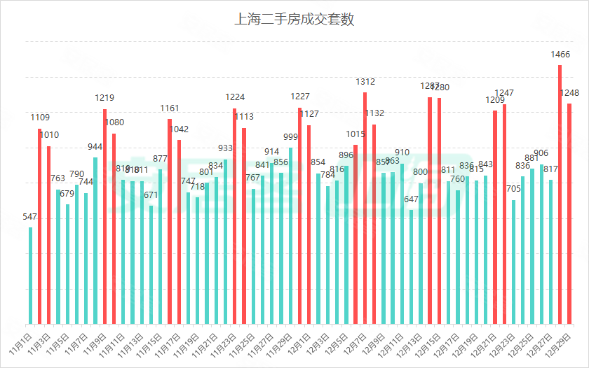 年底上海二手房热度依然不减,周末单日成交量创下年内新高。 网上房地产数据显示,12月28日(周六),上海单日二手房网签成交1466套,超越10月13日的1334套,创年内二手房单日成交新纪录。12月29日(周日),网签成交量仍维持高位,成交套数1248套,周末两日共计成交套数达2714套,亦成为年内成交套数最多的一个周末。 同时,根据网上房地产数据,12月的9个周末日,二手房(含商业)成交量全部破千,日均成交1256套。 ![]()