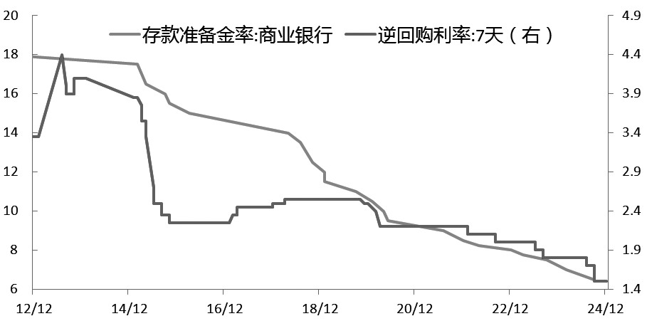 图为主要期限国债收益率走势(单位:%) 地产调整、政策宽松推动债券市场走牛。笔者认为,2024年债券市场走势可分为五个阶段,除“4月下旬至4月底”和“9月下旬至10月初”债券收益率短暂快速上行外,其余时间基本以回落为主。主要原因是房地产市场持续调整,央行实施支持性货币政策,以及外部环境不确定性增多。 2024年1月至4月下旬,10年期国债收益率从2.55%回落至2.22%。一是经济数据分化,地产投资降幅扩大,官方制造业PMI连续两个月处于临界点下方,市场避险情绪升温;二是中央经济工作会议要求以进促稳,稳健的货币政策要灵活适度,央行降准落地,市场资金面合理充裕,央行行长表示降准还有空间;三是5年期以上LPR大幅下调,长端债券投资性价比提高。 4月下旬至4月底,10年期国债收益率回升至2.34%。主要是央行发言人和央媒多次提示长端利率风险,同时超长期特别国债供给增加,推动债券收益率短暂快速上行。 5月初至9月下旬,10年期国债收益率回落至2.04%。一是经济景气指数回落,房地产市场继续调整;二是社融存量同比总体回落,M2同比持续走低,M1增速转负,企业融资活跃度下降;三是央行继续实施支持性货币政策,降准降息落地,且央行启动国债买卖操作,推动债券收益率再创新低。 9月下旬至10月初,10年期国债收益率快速回升至2.19%。主要是各部委货币、财政、地产等稳增长政策落地,权益市场大幅回升,股债“跷跷板”效应显现,带动债券收益率短期快速回升。 10月初至12月底,10年期国债收益率自2.19%快速回落至1.7%。一是特朗普当选美国总统,表示将对所有自中国进口的商品加征10%的关税,引发市场担忧,打压市场风险偏好;二是房地产投资继续回落,拖累经济增速;三是中央政治局和中央经济工作会议指出要实施适度宽松的货币政策,宽松预期升温推动债券收益率快速下行。 2025年继续实施积极的财政政策、宽松的货币政策。2024年中央经济工作会议明确指出要实施更加积极的财政政策,提高财政赤字率,增加发行超长期特别国债。为了应对当前经济发展形势的变化,财政政策变得更加积极。当前我国整体杠杆率偏高,但是中央政府部门杠杆率偏低,具有一定的加杠杆空间。预计2025年财政赤字率有望提升至4%左右,同时增加发行超长期特别国债1万亿元,将继续稳定基础设施建设投资,支撑社融存量维持较高增速。 中央经济工作会议明确指出要实施适度宽松的货币政策,适时降准降息,使价格总水平与预期目标相匹配,探索拓展中央银行宏观审慎与金融稳定功能,为经济增长提供适宜的金融环境。预计2025年存款准备金率下调幅度将超过100BP,7天期逆回购利率下调幅度将超过30BP,降至1%附近。同时,央行将继续通过国债买卖、买断式逆回购操作等创新政策工具向市场投放基础货币,保持流动性充裕。 稳地产政策持续出台,政策效果逐步显现。中央经济工作会议要求稳住楼市,持续用力推动房地产市场止跌回稳,合理控制新增房地产用地供应,推动构建房地产发展新模式。2023年下半年以来,多部委和地方通过四个“取消”、四个“降低”等措施稳定房地产市场,引导商业银行将存量房贷利率降至新发放贷款利率附近,同时要实行地方政府专项债券投向领域“负面清单”管理,允许用于土地储备、支持收购存量商品房用作保障性住房,扩大专项债用作项目资本金范围。