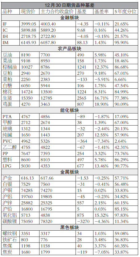 市场基差 迷你学人 12月31日 备注:1.生猪、鸡蛋、玻璃、铁矿石、焦煤已折合盘面相同单位价格;2.品种现货价采用交割基准地报价;3.基差=现货价格-期货价格;4.基差率=(现货价格-期货价格)/现货价格;5.基差监测为5年度分位,即当日基差在近5年的基差中的分布情况,若品种上市不足5年,则采用上市以来数据;6.若基差在统计区间上沿(85%以上),其大概率有缩窄可能,若基差在统计区间下沿(15%以下),其大概率有扩大可能。(福能期货 郑晓艳) (责任编辑:迷你学人)