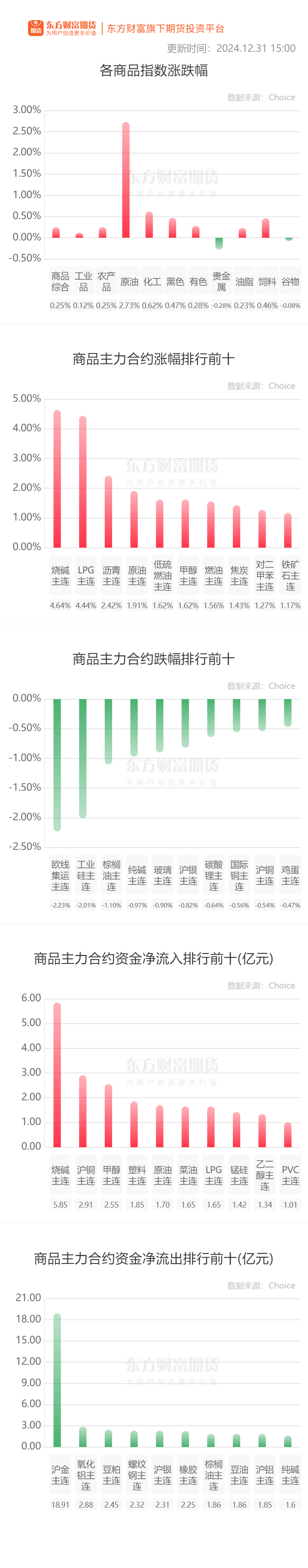 行情纵览![]() 宏观产经央行网站:为支持资本市场健康稳定发展,中国人民银行将于近期开展第二次证券、基金、保险公司互换便利操作,互换期限1年,可视情展期,面向符合条件的证券、基金、保险公司开展操作,互换费率由参与机构招投标确定。即日起接受机构申报。 证监会网站:为落实中央经济工作会议精神和全国金融系统工作会议要求,相关机构积极申请,中国证监会商中国人民银行在首批20家参与机构基础上,根据分类评价、合规风控等条件增选了20家参与机构,形成40家备选机构池。每批次操作时,根据意向参与规模筛选出20家左右的机构参与人民银行招标操作。目前,第二次互换便利操作的各项准备工作就绪,今天开始操作。 央视新闻:韩国宪法法院方面表示,针对尹锡悦的总统弹劾案的审理正式开始。宪法法院方面已加强警卫保障。 品种资讯黑色系期货 铁矿石:根据调研数据,12月份实际有38座高炉进行检修,日度铁水减量为16.35万吨。高炉检修主要集中在华北,华东和华中地区。同时,有24座高炉恢复生产,日度增加铁水产量10.2万吨。复产高炉主要集中区域跟检修趋同。12月份高炉检修影响量大幅增加。数据显示,12月份高炉检修共导致铁水产量净减少778.15万吨,比11月份增加了184.32万吨。日均铁水产量减少约6万吨。预计1月铁水产量环比12月或有提升,但提升空间有限。(上海有色网) 钢材:12月31日,陕西钢铁集团对全区域及中西部钢厂上调20元/吨,其中,西安龙钢大螺纹基价执行3380元/吨。(西本新干线) 农产品期货 生猪:12月31日,安徽生猪出栏均价16.06元/公斤,较昨日上涨0.29元/公斤。江苏生猪出栏均价16.39元/公斤,较昨日上涨0.33元/公斤。大体重猪源同比减少,且月底养殖端出栏减少,需求增加,对行情有支撑。预计短线价格小幅偏强。 江西生猪市场均价为15.53元/公斤,今日价格上涨0.09元/公斤,外三元市场主流价为15.50-15.60元/公斤。今日部分头部集团厂供应量不减,大猪价格稳中调整,标猪低价继续上涨。预计明天江西猪价稳中偏强运行。(我的钢铁网) 大豆:上周国内油厂大豆、豆粕库存均上升。监测显示,12月27日,全国主要油厂进口大豆商业库存656万吨,周环比上升19万吨,月环比上升109万吨,同比上升44万吨,较过去三年均值高217万吨。主要油厂豆粕库存70万吨,周环比上升11万吨,月环比下降14万吨,同比下降24万吨,较过去三年同期均值高1万吨。(国家粮油信息中心) 棕榈油:据马来西亚独立检验机构AmSpec,马来西亚12月1-31日棕榈油出口量为1381837吨,较上月同期出口的1417436吨减少2.5%。(新华财经) 有色/贵金属期货 黄金:美国商品期货交易委员会(CFTC)数据显示,截至12月24日当周,COMEX黄金投机者净多头头寸减少19678份合约至184260份合约;COMEX白银投机者净多头头寸减少1487份合约至20590份合约。(新华财经) 氧化铝:2024年12月(31天)中国冶金级氧化铝产量环比增长1.67%,同比增加9.80%。截至12月31日,中国冶金级氧化铝的建成产能为10302万吨左右,实际运行产能为环比小降0.44%,开工率为86.30%。2024年全年国内的冶金级氧化铝产量同比增长4.86%。(上海有色网) 沪镍:据Mysteel调研统计,截止2024年12月27日,中国精炼镍27库社会库存减少543吨至46696吨,降幅1.15%;仓单库存减少380吨至28847吨;现货库存减少113吨至11874吨,其中镍板减少51吨,镍豆减少62吨;保税区库存减少50吨至5975吨。(我的钢铁网) 能化期货 能化:美东时间12月30日,美国天然气期货价格突然飙涨,NYMEX天然气期货2月合约日内最高暴涨超24%。分析称,天然气价格飙升的主要原因是,天气预报显示美国东部和中西部地区将迎来更为寒冷的天气,推升了供暖需求的预期。消息面上,乌克兰方面表示,从明年1月1日起,将暂停俄罗斯输欧天然气过境乌克兰。(券商中国) 沥青:截至12月30日当周,全国104家沥青社会库存总量为83.6万吨,较前一周下降1.8%。(隆众资讯) 玻璃:截至2024年12月底,玻璃日熔量回落到16万吨附近,较年初的17.3万吨下滑1.3万吨。2024年,玻璃产量预估在6171万吨左右,增速在2.4%~2.5%。(期货日报) 晚间关注受元旦假期影响,国内今夜无夜盘交易。 (文章来源:东方财富研究中心) (责任编辑:迷你学人) |