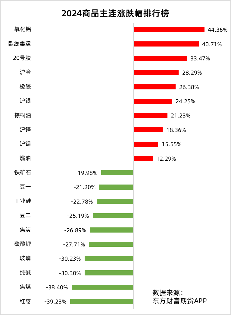 2024年已至尾声,回首这一年,商品市场各板块“争奇斗艳”。从多重利好下价格屡创新高的黄金,到受国际局势影响“情绪多变”的欧线集运;从下半年如黑马般异军突起的氧化铝,到经历漫长下跌后步入盘整态势的碳酸锂...各个期货品种 “你方唱罢我登场”,牵动着屏幕前每一位市场参与者的神经。 那么,到底哪些品种在涨幅榜上勇夺 “魁首”,又是哪些品种跌得最狠呢?一图速览2024年商品主连涨跌幅排行情况! ![]() 注:在东方财富期货APP行情页点击【主连】,滑动至最右侧,即可查看商品主连今年涨跌幅情况。 (文章来源:东方财富研究中心) (责任编辑:迷你学人) |