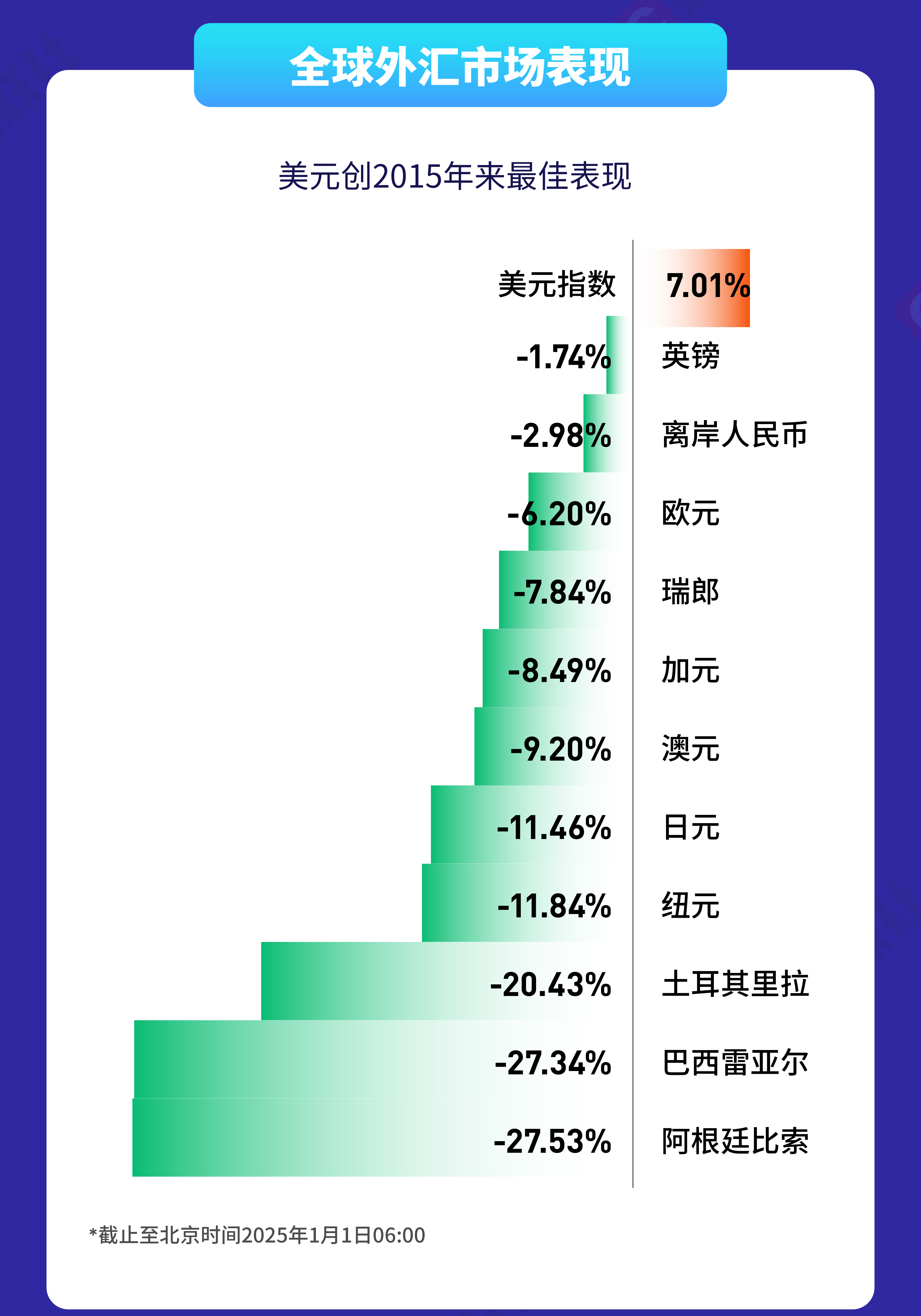 全球股市:标普500指数连续两年涨超20% 上证指数重返3300点 毫无疑问,今年全球有许多熟悉的“赢家面孔”。苹果、微软、英伟达等科技巨头持续上涨,推动标普500指数连续第二年涨幅超过20%。上一回出现这样的情况,还是1998年。除了今年4月和8月外,标普500指数每个月都至少创出过一次历史新高,全年共计57次。 除了美股外,全球绝大多数指数基金今年大都取得正回报。日经225指数、英国富时100指数、德国DAX指数均在年内创历史新高。 特别值得一提的是德国市场,虽然德国的政治、经济局势均陷入混乱,但德国股市有自己的“7巨头”——软件巨头SAP、军工龙头莱茵金属、工业集团西门子、西门子能源、德国电信,以及安联和慕尼黑再保险。其中乘上AI浪潮的SAP一家,就贡献了德国股指涨幅的4成。 同样陷入政坛混乱的法国,则成为了今年少数基准指数负收益的国家。在德国、意大利、西班牙股指均交出两位数涨幅的背景下,法国CAC40指数全年下跌了2.2%。除了政局引发的混乱外,该国股指高度倚重的奢侈品巨头也在今年表现不佳。另一个受到政局影响的市场是韩国股指,在全球股市普遍走高的背景下,交出了全年近10%的跌幅。 中国股市也在2024年迎来了年线级别的止跌回升。对于大多数中国投资者而言,在回忆 “9·24行情”的收益之余,更多思绪已经转向2025年的A股市场如何在“适度宽松”的信号下演绎。 大宗商品:可可、比特币上演翻倍行情小麦、大豆表现不佳 ![]() 经过年末的激烈争夺后,纽约可可以较大的优势力压比特币,成为2024年的大宗商品之王。全球主要产区的糟糕天气,叠加供需紧张和市场流动性不足,使得可可成为全年商品市场的关注焦点。阿拉比卡咖啡和冷冻橙汁期货,也凭借惊人的涨幅挤进前5。 黄金虽然在年末冲高回落,但全年27%的涨幅依然是2010年以来的最强表现;原油则在全球经济复苏的担忧中连续第二年下跌。 与可可和咖啡豆相反,大豆、小麦等期货在2024年出现了较大幅度的下跌,主要原因与全球种植面积和产量增加、导致供应过剩担忧有关。 外汇:美联储降息前景模糊美元创2015年来最佳表现 ![]() 随着美国经济指标、特朗普2.0政策的不确定性抑制美联储降息预期,使得美元与其他主流货币利差缩小的预期逐渐落空,美元指数在四季度走出了一波“倔强拉涨”的行情,将全年涨幅扩大至7%。这也是2015年以来美元的最强涨幅。 受到美元走强影响,日元、澳元、纽元(新西兰元)的年内贬值幅度接近10%。相比较而言,英镑、人民币的走势明显更加稳健。 2024年的另一大变化,是土耳其里拉、阿根廷比索这类常年“大额贬值”的货币,在相关国家国内通胀受到控制后企稳。巴西雷亚尔则是在年末的财政案冲击后,出现了一波快速的贬值。 (文章来源:财联社) (责任编辑:迷你学人) |