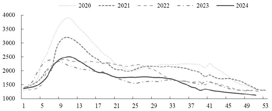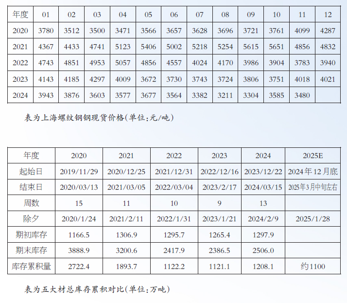 2024年成材价格回顾 建筑钢材通常可分为钢结构用钢和钢筋混凝土结构用钢筋。建筑钢材跟随季节的变化,消费呈现较为明显的淡、旺季切换特征。根据年度消费表现来看,春季和秋季的钢材消费强度显著强于冬季,特别是春季3—4月的消费量,以螺纹钢为例,其日均消费量较1—2月的消费量低点增幅达到50%。每年进入冬季,钢材冬储就成为整个市场关注的焦点,价格变化牵动整个市场。回顾2024年钢材价格的总体走势,呈现震荡下行趋势。这一变化趋势主要受到原材料供应逐渐宽松以及消费相对有所减弱的影响。驱动价格变化的关键因素也悄然发生变化,由过去两年的原材料价格主导,逐步转变为成材消费的需求影响。 2024年春节过后,由于部分基础设施建设以及房地产项目复工复产缓慢,市场情绪普遍低迷,导致钢材市场供需两弱,行业形成了负反馈。进入4月,随着钢材消费的回暖和供给的持续低位,库存去化显著改善,价格随之反弹。同时,宏观预期的回暖为价格震荡上涨提供了有力的支撑,期货价格普遍高于现货价格。然而,从5月底开始,消费动力显现不足,加之期货价格的升水,市场遭遇了新一轮的下跌。在此期间,外部宏观环境的整体转弱与黑色板块共振下跌。此外,叠加螺纹钢新旧国标的转换,进一步加剧了市场的悲观情绪,即便在低库存的情况下,价格也一度跌破3000元/吨的整数关口。进入9月底,得益于产量的降低和消费的环比改善,成材库存持续减少,基本面呈现出明显的向好趋势,相关部门释放的一系列利好极大地提振了市场预期,钢材价格迅速反弹。进入12月,随着市场情绪的消退,钢材价格重新回归基本面,价格也随之回落。