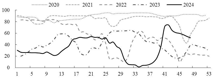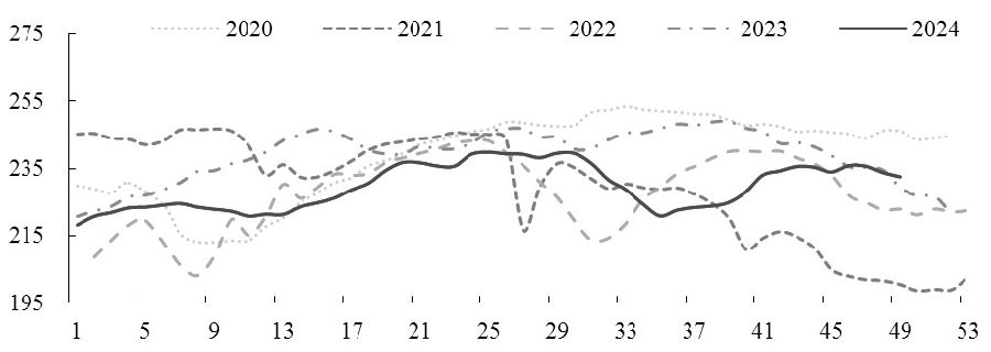 图为上海螺纹钢和热轧卷板价格走势(单位:元/吨) 企业面临亏损时,往往会采取主动减产措施,甚至进行停炉检修,以此遏制淡季库存累积的速度。2024年原料端供需偏宽松,导致钢材价格重心下移,在此背景下,钢厂普遍盈利能力较低,处于历年同期低位水平。2024年9月后,随着预期提振,钢铁企业盈利显著改善,247家钢铁企业盈利率显著改善,截至2024年12月初,钢厂盈利率仍在50%左右。 临近冬储季节,247家高炉产能利用率有所降低,但仍处于历年同期较高位置。截至2024年12月初,日均铁水产量维持在230万吨以上,相较2023年同期呈现增长态势。2024年房地产数据方面仍偏弱,制造业保持韧性,出口保持较高增长,粗钢产量小幅下降。由于2024年9月政策的提振,钢铁企业盈利显著改善,钢厂检修、减产速度放缓。