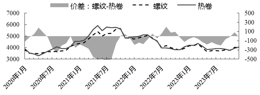 图为上海螺纹钢/热轧卷板现货价格(单位:元/吨) 冬储前后成材价格变化 进入冬季,“成材冬储”成为市场交易的主要逻辑。截至2024年12月初,已有多家钢厂公布了2024年的冬储政策,2024年仍是西北、东北地区出政策时间较早。尽管目前钢材产量和库存都维持在低位区间,五大材库存更是处于历史同期低位,但是由于市场普遍预期钢材需求仍存在较大压力,预计冬储仍维持偏弱格局。2024年北方冬季偏暖,气温下降的速度较慢,下游需求减弱速度低于往年同期。截至2024年12月初,多数贸易商对冬储计划的确定仍持观望态度,仅有少数贸易商表达了冬储意愿,但前提是价格需维持在较低水平。部分贸易商虽有冬储计划,但是鉴于整体资金情况紧张,其冬储量预计缩减。与此同时,国内钢厂自储意愿同样不强,许多钢厂冬季有减产计划,预计钢厂仍以被动冬储为主,且自储量有限。 2024年11月底,东北钢厂冬储政策出台,目前已有东北、西北等多家钢厂公布冬储政策,2024年的冬储正式拉开序幕。从农历时间来看,与往年冬储开始时间基本一致(春节前9~10周)。西北和东北地区由于天气原因导致冬储政策出台较早,其他地区多数钢厂的冬储政策集中在春节前3~6周公布。 回顾过往十几年的冬储过程,贸易商冬储较为成功的年份,往往伴随来年消费旺盛或建立在低价格的前提上。回顾过去5年钢材价格走势,其中2021—2023年春节后月均价格(次年3、4月)较春节前月均价格(12月和次年1月)上涨,2023年3月价格虽有所上涨,但到4月价格出现明显回调;2024年3—4月价格低于1—2月价格。2023年和2024年贸易商冬储效果不理想,其冬储盈利能力下降,鉴于此,近年来贸易商倾向于逐步缩减冬储量,作为一种降低冬储风险的策略。 建筑用钢量持续降低,但是由于制造业用钢仍保持韧性,加之钢材出口仍具备优势,实际钢材产量仅出现了小幅度的缩减。螺纹钢和热轧卷板价差方面,2021年价差较大;然而,自2022年起,螺纹钢和热轧卷板价差则呈现窄幅波动的态势。