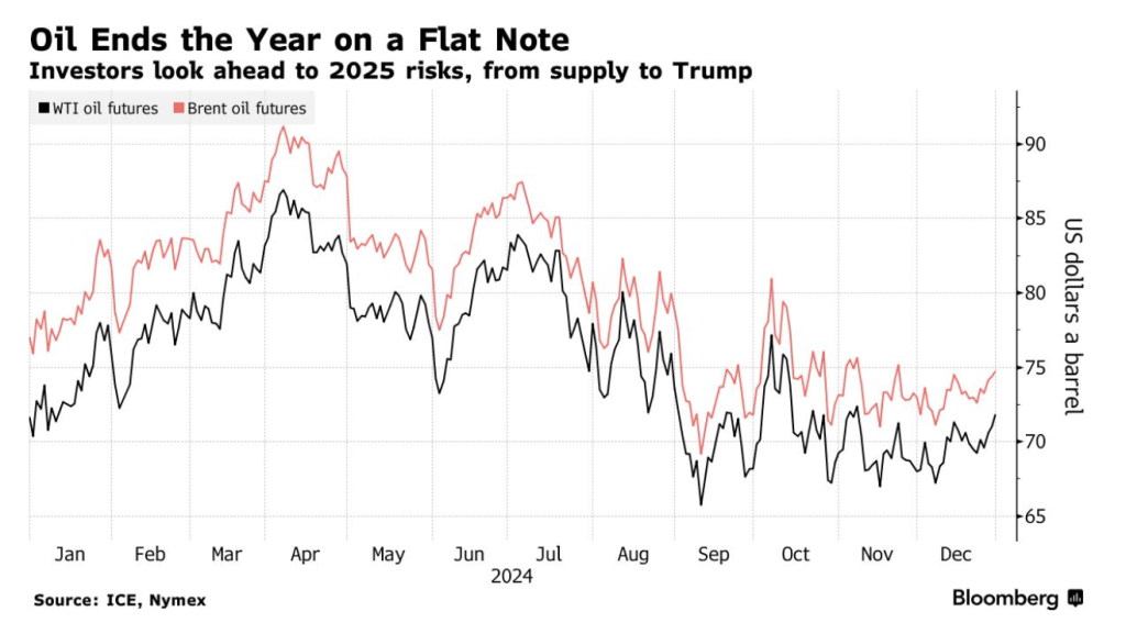 黄金:大幅上涨 2024年12月31日,COMEX黄金1月期货收涨0.9%,报2629.20美元/盎司,2024年累计涨幅27.5%,创下2010年以来最大年度涨幅。 日益不确定的全球紧张局势和经济变化促使投资者寻求更安全的资产,推动了对投资贵金属的需求。 回顾2024年,国际金价从2063.04美元一路升至最高2790美元,年内最高涨幅超35%,年内涨幅达近27%。世界黄金协会统计,2024年金价已创下30余次新高。 不过,2024年,随着金价反复刷新历史新高,实物消费、投资需求延续边际回落格局,央行购金步伐也受到高价格制约而边际放缓。 对于2025年,投资者关注的焦点是美国货币政策的不确定性、特朗普总统任期可能带来的摩擦以及中国为恢复增长所做的努力。 华尔街预计,黄金将在2025年再度闪耀。摩根大通、高盛和花旗的分析师都将黄金在2025年的目标价定在3000美元/盎司。 分析师表示,随着投资者对收益率下降感到失望,货币市场基金持有的3.7万亿美元中的一部分将进入持有黄金的ETF,摩根大通分析师Greg Shearer称这是“黄金周期中最看涨的部分”。该分析师指出,黄金的另一个优点是,这种金属除了作为财富的储存之外几乎没有什么用途,“黄金没有其他大宗商品的工业包袱,即在贸易中断的打击下被拖垮”。 Exinity集团首席市场分析师Han Tan表示,“如果在特朗普2.0下,全球地缘政治紧张局势加剧,可能会促使投资者转向这种久经考验的避险资产,那么黄金多头可能将在未来一年再创辉煌。” 世界黄金协会在最新发布的《2025年黄金展望》报告中指出,2025年黄金价格将实现正增长,但增长幅度有所放缓,“上行空间可能来自央行需求强于预期,或来自金融状况迅速恶化导致资金流向安全资产。相反,货币政策逆转导致利率上升,可能会带来挑战。” 软商品:可可期货成最大赢家 可可成为了2024年表现最佳的大宗商品。数据显示,ICE可可期货主连2024年内累计涨幅达174.88%,远超COMEX黄金期货。 ![]() 由于西非(世界上最大的粮食种植区)产量下降,导致大规模供应短缺,可可期货价格几乎上涨了两倍。2024年12月18日,纽约可可期货价格创下历史新高,飙升至每吨近1.3万美元的历史高位。 受西非收成预期好转的影响,可可市场在2024年4月份飙升至每吨不到12000美元后开始降温。2024年11月份,天气不利于作物生长,可可市场价格再次上涨,大幅复苏的希望也因此变得渺茫。 可可价格的迅速上涨是由几个因素推动的。首先,科特迪瓦和加纳等主要生产国(占全球产量的近70%)的恶劣天气条件加上农作物疾病,限制了总体产量。除此之外,全球库存较低、货运成本飙升,以及多年来可可种植投资不足,进一步加剧了供应紧张。 ING在其网站上表示:2023年至2024年销售年度,全球可可市场出现47.8万吨的缺口,这是60多年来最大的缺口,也是连续第三年出现缺口。这一短缺是由于西非,特别是科特迪瓦和加纳的农作物歉收造成的。 “短缺导致全球可可库存降至十多年来的最低水平。虽然 2024年-2025年销售年度的前景看起来更好,但人们仍然担心西非的天气发展及其对本季产量的影响。” ING表示,“目前的预测显示,占全球产量70%以上的西非产量将小幅上升。然而,由于最近天气恶劣,这一趋势存在风险。” ![]() 高盛商品衍生品分析师Hugo Fuentes表示,由于结构性供应赤字、消费者对冲不足以及库存水平处于历史低位,可可价格有望大幅上涨。 “考虑到来自非主要产地供应有限,空头回补积极,投机性买盘仍有空间,预计市场可能会迎来新一轮的价格上涨。”Fuentes认为,可可主要产地的产量预计将延续低位水平,而非主要产地的供应有限,不足以缓解市场的短缺状态。 大幅上涨的还有咖啡期货。 2024年以来,有咖啡行业价格风向标之称的美国C型咖啡期货(KC.NYB)价格持续上涨,从1月2日的188.5美分/磅上涨至12月31日的320.85美分/磅。当地时间2024年12月10日,3月交割的阿拉比卡咖啡豆期货价格触及每磅(1磅合0.454公斤)348.35美分的盘中新高,该价格上次达到这一水平还是在1977年。 价格波动主要源自世界第一大阿拉比卡豆生产国巴西以及越南遭遇极端干旱天气导致咖啡豆减产,以及欧盟即将实施的零毁林法案带来的政策不确定性。 能源:走势分化 2024年12月31日,布伦特原油期货收涨0.88%,至每桶74.64美元,较2023年77.04美元的最终收盘价下跌了约3%;WTI原油期货收涨1.03%,至每桶71.72美元,与2023年最终收盘价基本持平。 自2024年10月中旬以来,原油一直处于窄幅交易区间,地缘政治动荡为原油提供了支撑,而2025年全球供应过剩的前景则为原油提供了阻力。一些银行预测,未来两年原油价格将继续走弱。另一方面,某些黑天鹅事件,可能为油价提供短期支撑。 ![]() Price Futures Group高级分析师Phil Flynn表示,随着特朗普上台的一些更严厉的政策出台,预计进入新的一年,原油市场将会更加紧张。他还提到了印度需求走强和最近中国制造业数据走强。 新加坡咨询公司JTD Energy Services Pte的董事兼创始人John Driscoll则说:“我并不完全认同这种压倒性的悲观情绪。我们可能仍会看到石油生产商在上游方面采取一些纪律措施,而且我也不排除地缘政治事件或极端天气等黑天鹅事件的可能性。” 市场普遍预计2025年石油市场将供过于求。OPEC和国际能源署(IEA)都下调了对2024年和2025年原油需求增长的预期。其中,IEA认为,即使OPEC及其盟友在油价下跌的背景下将提高产量的计划推迟到2025年4