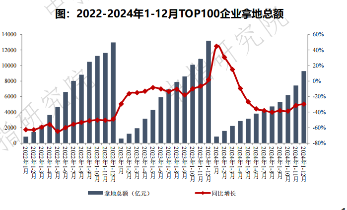 土拍市场是房地产市场的先行指标,观察土拍市场能窥探房地产市场的“冷暖”变化。 2024年10月以来,上海、深圳、杭州、成都等热点城市土拍市场持续活跃,接连出让多宗高总价地块,带动房地产百强企业2024年全年拿地总额同比降幅收窄。 中指院最新数据显示,2024年,百强房企拿地总额为9280亿元,同比下降29.7%,降幅收窄1.8个百分点。 ![]()