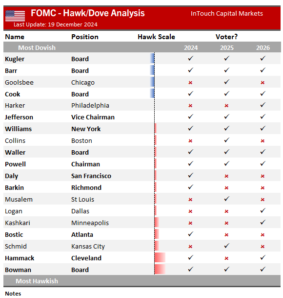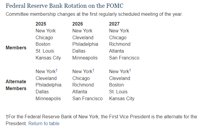 2024年12月的议息会议上,美联储超预期“鹰派降息”,向市场释放出2025年放缓降息步伐的信号。在美国通胀前景变得更加复杂之际,美联储制定利率的联邦公开市场委员会(FOMC)2025年也迎来“大换血”,这或将进一步助推其货币政策的“鹰派”走向。美联储官网公布的信息显示,2025年轮换的四名有投票权的新成员中有三位被市场视为“鹰派”代表。 2025年美联储票委轮替 三位“鹰派”及一位“鸽派”加入 美联储官网公布的信息显示,2025年FOMC将轮换四名有投票权的新成员。拥有投票权的新成员将包括波士顿联储主席柯林斯(Susan M. Collins)、芝加哥联储主席古尔斯比(Austan D. Goolsbee)、圣路易斯联储主席穆萨莱姆(Alberto G. Musalem)以及堪萨斯城联储主席施密德(Jeffrey R. Schmid)。 ![]() 2024年的4名轮值票委则是里士满联储主席巴尔金(Thomas I. Barkin)、亚特兰大联储主席博斯蒂克(Raphael W. Bostic)、旧金山联储主席戴利(Mary C. Daly)、克利夫兰联储主席哈马克(Beth M. Hammack)。在2024年轮值的票委中,除了克利夫兰联储主席哈马克在12月的会议上基于对通胀的担忧投了反对票,另外三位被认为立场相对偏温和中间派。 根据规定,所有19位FOMC成员都参加每次FOMC会议,但只有12位有投票权:7位美联储理事加上纽约联储主席,以及其余11位地区联储主席中的4位。4位地区联储主席的任期为一年。 根据InTouch Capital Markets的报告,芝加哥联储主席古尔斯比是这四人中唯一的“鸽派”。该机构将波士顿联储主席柯林斯和圣路易斯联储主席穆萨莱姆列为“轻度鹰派”,而堪萨斯城联储主席施密德则为“中度鹰派”。