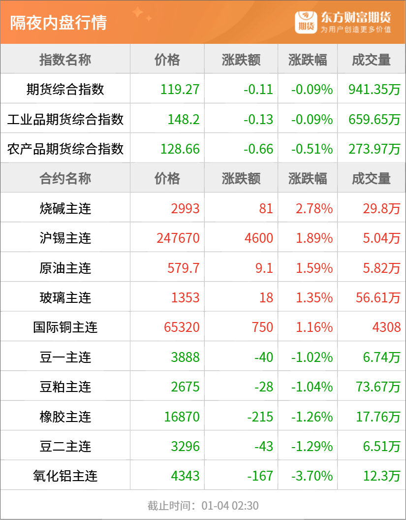 隔夜行情![]() ![]() 每日精选央行重磅发声!提及用好用足政策工具维护资本市场稳定运行! 美联储重大调整!内部分歧或加剧降息不确定性攀升 美国突传重磅!拜登下令禁止开展新的海上石油和天然气开发项目 宏观产经央视网:国务院总理李强主持召开国务院常务会议,研究推进城市更新工作,听取保障农民工工资支付工作情况汇报,审议通过《古树名木保护条例(草案)》。会议还研究了其他事项。 央行:央行货币政策委员会召开2024年第四季度例会。会议研究了下阶段货币政策主要思路,建议加大货币政策调控强度,提高货币政策调控前瞻性、针对性、有效性,根据国内外经济金融形势和金融市场运行情况,择机降准降息。 新华社:国家发改委副秘书长肖渭明在“中国经济高质量发展成效”系列新闻发布会上表示,将适当提高退休人员基本养老金和城乡居民基础养老金,提高城乡居民医保财政补助标准。 品种资讯黑色系期货 螺纹钢:12月下旬,21个城市5大品种钢材社会库存659万吨,环比减少12万吨,下降1.8%,库存降至本年最低水平;比11月下旬减少24万吨,下降3.5%;比上年同期减少70万吨,下降9.6%。螺纹钢库存252万吨,环比减少8万吨,下降3.1%,库存继续下降,降幅有所收窄;比11月下旬减少26万吨,下降9.4%;比上年同期减少53万吨,下降17.4%。(中国钢铁工业协会) 硅铁:硅铁市场成交一般,下游按需采购,厂家面临一定成本压力,减产动作有所增多。本周Mysteel统计全国136家独立硅铁企业开工率为37.11%,较上期下降0.6%;日均产量为15230吨,较上期下降320吨。目前硅铁开工率已降至近7个月来新低。(我的钢铁网) 锰硅:南方产区增减产动作俱有,北方内蒙新点火炉子产量仍在陆续提升,锰硅整体供应水平仍有上涨。本周Mysteel统计全国187家独立硅锰企业样本开工率为45.29%,较上周增长0.26%;日均产量为28740吨,环比增加405吨,创近5个月来新高。(我的钢铁网) 农产品期货 棉花:12月,新疆棉花收购进入收尾阶段,收购量持续下降,月末仅有零星尾花收购,月内棉纺织市场淡季特征明显,皮棉价格回落,籽棉收购价格跟随下跌。全国皮棉加工总量超过600万吨,但增量较高峰期明显回落,部分轧花厂已结束加工,停工企业也逐渐增多。(中国棉花协会) 棕榈油:印尼能源部长表示,2025年生物柴油分配法令已签署。政府计划于2025年实施B50生物柴油,2026年实施B60。 交易商表示,印度12月葵花籽油进口量环比上月减少22%至26.5万吨,豆油进口量环比上月增加3%至42万吨,为4个月以来最高水平;棕榈油进口量环比上月减少40%至50.3万吨,为9个月以来最低水平。印度12月植物油进口量环比上月减少25%至119万吨,为3个月以来最低水平。(财联社) 大豆:巴西全国谷物出口商协会(ANEC)表示,巴西12月大豆出口预计为147万吨,低于之前估计的162万吨;巴西12月玉米出口预期为362万吨,较之前估计的410万吨有所下降,巴西12月份豆粕出口预计为180万吨,较此前估计的210万吨有所下调。(新华财经) 有色/贵金属期货 多晶硅:硅业分会发布12月份硅产业供应分析。硅业分会表示,展望2025年1月市场供应情况,预计各家企业继续维持低位开工,月产仍有一定程度的下降空间,1月多晶硅产出预计在10万吨以下,环比减少5%左右。(财联社) 沪镍:印尼能源部长表示,印尼正在审查镍矿开采配额,寻求防止价格进一步下跌。(财联社) 氧化铝:据Mysteel了解,2025年1月3日海外市场氧化铝以西澳FOB681美元/吨的价格成交3万吨,3月初船期,去向不知。此笔成交较上一笔价格(2024年12月16日成交)上涨0.25美元/吨。(Mysteel) 能化期货 原油:美国至1月3日当周石油钻井总数482口。(财联社) 据多家媒体报道,知情人士透露,预计美国总统拜登将永久禁止在大西洋和太平洋水域的大片海域开展新的石油和天然气钻探活动,而特朗普政府可能很难撤销这一禁令。拜登计划援引1953年的《外大陆架土地法》的一项模糊条款,可以从未来的石油和天然气租赁中撤回联邦水域。 (界面) 聚丙烯:2024年12月,国内聚丙烯市场背离历史季节性下行趋势,出现区间窄幅波动。以华东地区为例,截至2024年12月27日,华东拉丝级别PP现货均价在7506.75元/吨,环比微涨0.03%。卓创资讯PP分析师宁晓琴表示,价格偏强整理的主要推动力在于市场基本面未见显著利空,整体供需态势呈现弱平衡。(大河财立方) 环球视野央视财经:由于风力发电量远超需求,2日,欧洲最大电力市场德国出现4个小时的负电价,也就是说,发电商需向用户付费消耗过剩电力。随着风力和太阳能发电装机容量的快速增长,2024年欧洲多个国家累计负电价小时数创下新高。 央视新闻:央视记者当地时间1月4日获悉,受新一轮风暴影响,美国北部有14个州约4700万人处于冬季警报之下。据了解,此轮风暴将会给美国北部地区带来强降雨雪以及冰冻天气,并对民众出行造成影响。 每日关注无 (文章来源:东方财富研究中心) (责任编辑:迷你学人) |