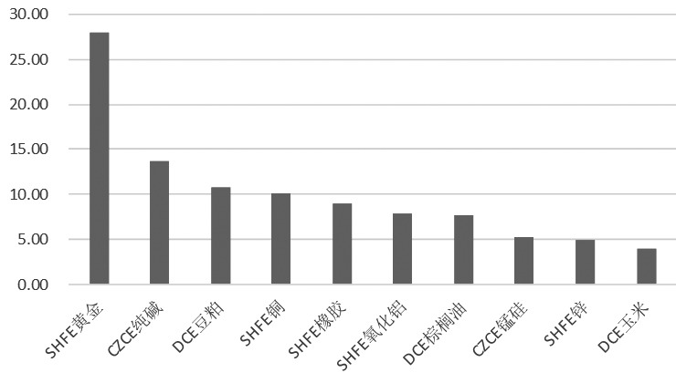 图为商品期货资金流入前十名(亿元)