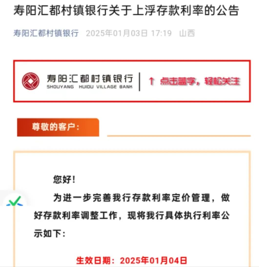 【导读】揽储压力下,多家中小银行逆势上调定存利息 在存款利率持续走低的趋势下,部分地方性中小银行却逆势上调定期存款利息。 部分银行宣布加息 岁末年初,多家农商行、村镇银行发布公告,官宣调整人民币存款利率。 1月3日,寿阳汇都村镇银行发布关于上浮存款利率的公告。自1月4日起,该行一年期、二年期、三年期、五年期定期存款利率分别上调为1.80%、1.85%、2.15%、2.15%。 ![]()