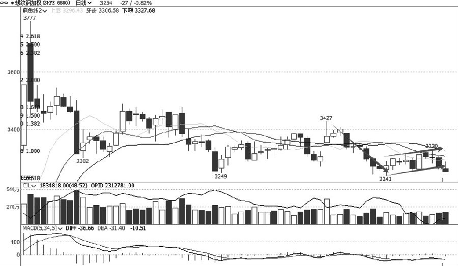 从纯碱加权日线图看,纯碱自2024年国庆节前后大幅冲高回落以来,形成了震荡走低格局。经历国庆节后的回落,价格再次反弹,但是并未超越b浪高点,这就为后市的走低打下了基础。均线系统由向上倾斜转为向下运行,转为空头排列。虽然价格跌势运行时间较长,但下跌幅度并不大,直到2024年12月中旬才跌破第一轮下跌的低点,周一再创新低,整体走势属于二次探底的过程。 螺纹钢 跌破支撑