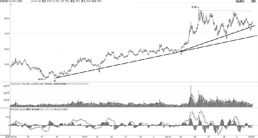 本轮白银牛市的第一阶段始于2022年7月的4000元/千克至6000元/千克,由主要低点A、B和C构成了白银上行趋势线,支撑点在7000元/千克附近。白银牛市的第二阶段始于有效突破6000元/千克,加速上行至8500元/千克上方,由主要低点C、D和E构成了白银的加速上行趋势线。由此看到,白银近一周的上行就是基于此支撑,可以看作是一种无量配合的短期反弹。中期来看,白银跌破加速趋势线,向下寻求长期支撑的概率较大。(顾敏忠 期货投资咨询从业证书编号Z0002449) (责任编辑:迷你学人) |