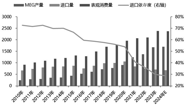 图为2010年以来PTA进出口变化趋势(单位:万吨) 3 中游乙二醇进口依存度逐步下降 自2019年以来,中国乙二醇行业新一轮扩产周期开启,伴随着国产大炼化项目以及多套大型煤制乙二醇装置的投产,中国乙二醇产能和产量呈快速增长趋势;同时乙二醇的进口依存度逐步下降,自2018年的58%下降至2023年的30%附近。其中,2023年,国内乙二醇进口量为588万吨,同比下降8.2%,因海外装置尤其是近洋地区受效益影响检修或减产较多,进口有所下降。2024年1—11月,乙二醇进口量在597.5万吨附近,同比减少59.2万吨,降幅在9%附近。从月度数据来看,乙二醇进口平均值在54万吨附近,其中以远洋货供应为主,2024年下半年近洋货源逐步恢复。2024年,因为海外装置检修或减产较多,尤其是中东与北美地区装置检修或减产较多,使得进口下滑,预计2024年国内乙二醇进口依存度下降至30%以下。从进口来源来看,乙二醇主要进口来自中东和北美地区。2024年1—11月,国内乙二醇进口来源有沙特、加拿大、美国等地,以上区域占国内乙二醇进口的79%左右。 展望2025年,全球乙二醇新增产能基本在中国,预计国内乙二醇新增产能160万吨,其中,四川正达凯60万吨/年装置计划在一季度投产,裕龙石化80万吨/年与宁夏鲲鹏20万吨/年的乙二醇装置计划在下半年投产。从进口来看,中东和北美低成本货源对国产货的冲击仍存在,但预计2025年进口增量有限,但随着乙二醇价格的上涨,以及乙二醇利润的逐步修复,不排除近洋地区乙二醇供应边际恢复。