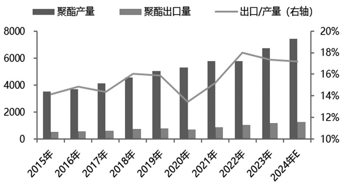 图为国内乙二醇进口量及进口依存度(单位:万吨) 4 下游聚酯产品出口平稳增长 2016年,聚酯市场整体供需格局得到明显改善;2017—2018年,聚酯行业景气度继续回升,聚酯产品利润较好,导致聚酯产能大幅扩张。近几年国内聚酯产能、产量呈现稳定增长趋势,市场供应宽松的局面逐步凸显,聚酯产品的出口量也逐步增加。最新数据显示,2024年1—11月,我国聚酯产品出口量累计1159.5万吨,同比增加134.9万吨,好于2023年同期的120.5万吨;聚酯产品进口量累计不足100万吨。聚酯产品累计净出口1125.4万吨(占同期聚酯产量的16.6%),同比增长13.3%,其中聚酯瓶片累计出口523万吨,同比增长26.2%;涤纶长丝累计出口352.1万吨,同比下降5%;涤纶短纤出口120万吨,同比增长7.5%。从产品细分结构数据可以看到,2024年聚酯产品出口提升主要还是瓶片的贡献,占比在43%;其次是长丝,占比在29%,长丝出口明显下滑;短纤出口占比10%,短纤出口增长相对平稳,而瓶片乃至薄膜的出口增量一直都相当可观;纤维与非纤环节的出口增长情况,与其供需结构和内销情况形成了明显的反差。