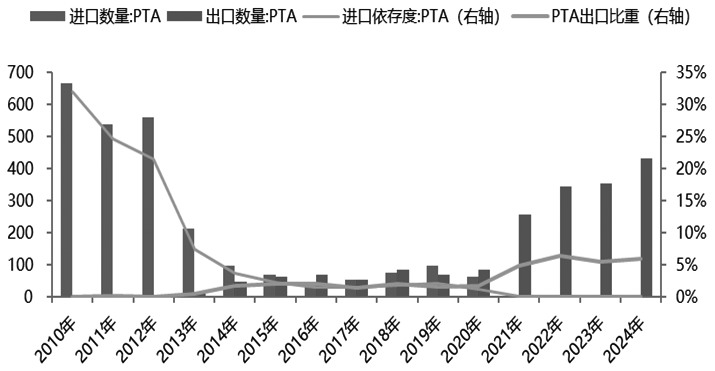 1 上游PX进口依存度逐年下降 2009—2022年,随着中国聚酯产业的快速发展,PTA产能大幅增加,进而带动PX需求快速增长。2011—2013年,全球PTA产能快速增长,PX供应偏紧,高利润刺激了PX装置的投产,导致2014年全球PX产能快速释放;同时PX行业利润出现压缩,但因国内PX产能增速持续放缓,PX进口依存度持续处于高位。2019年,随着恒力石化、浙江石化等大炼化投产,中国PX产能进入集中扩张周期,自此中国PX产能占全球比重快速提升,由2009年的18.7%提高至2022年的42.8%,同时也导致PX行业利润快速压缩至亏损。 随着国内PX供应稳步提升,PX进口依存度逐年下降,由2018年的59%快速下降至2022年的30%附近。2023年,因亚洲PX装置集中检修,加上亚洲出口美国的量增加,导致国内PX进口量下降明显,PX进口量为911万吨,进口依存度下降至21.4%附近。2024年1—11月,国内PX进口量为844万吨,同比增加1.36%,预估2024年PX进口依存度小幅下降至20%附近;而PX出口量一直很少,几乎可以忽略。 过去两年,因国内PX自给率不断提升以及受海外调油因素扰动,海外国家及地区对中国PX出口量持续缩减,但2024年降幅明显放缓。2024年1—11月,中国大陆PX主要进口来源地包括韩国、日本、中国台湾、文莱等地区,这几个区域的进口占比约86%,其中来自韩国的占比一直较大,因此,韩国PX的出口量及出口区域变化对亚洲PX的区域平衡影响较大。 2024年以来,中国大陆PX来自中东和日本的进口量下降较多,而来自中国台湾和东南亚文莱、越南、印尼等地区的进口量增加。由于台化150万吨新PTA装置在2024年4月投产,中国台湾向中国大陆出口增加;而越南主要是因NSRP装置在2023年运行不稳定,检修时间将近4个月,2024年装置恢复后,出口量大幅增加。目前我国PTA进口增量来源集中在东南亚地区,以装置恢复正常生产为主。从中长期角度来看,2024年年底开始随着新一轮PTA装置陆续投产,在国内需求提升而供应无明显新增情况下,PX进口趋势仍将维持。 2 中游PTA出口自2020年开始增加 近年来,下游聚酯纺织行业的蓬勃发展带动PTA产能迅速扩张。2010—2014年,中国PTA产能出现爆发式增长,翔鹭石化、逸盛石化、恒力石化等相继扩产,国内PTA进口依存度快速下降,自2010年的32%下降至2014年的3.6%。2017—2019年,PTA产能增速放缓,进口依存度维持低位,且逐步开始有出口现象。2020年以来,伴随着大炼化投产,上游PX的集中投产带来下游PTA行业的再次集中扩能,PTA进出口逐步发生逆转,且出口开始逐年增加。2021年,PTA进口量自2020年的60万吨偏上骤降至10万吨以下,至2023年,国内PTA进口量进一步降至2.38万吨。然而,2021年以来,PTA出口量绝对水平逐年增加,但因国内PTA产量也在增加,出口占比维持在5%~6%水平。 统计数据显示,2024年1—11月,国内PTA进口量为1.82万吨,出口量为415.97万吨,净出口414万吨,较2023年同期增长26.8%。预估2024年国内PTA出口量占PTA产量的比重在6.3%附近。从产销国来看,2024年1—11月,国内PTA主要出口到土耳其、越南、阿曼、埃及、印度、俄罗斯、巴基斯坦、沙特等地,以上区域占PTA出口的89%左右。未来两年,国内PTA仍有投产预期,随着国内PTA装置不断投产,行业平均加工费不断压缩,国内PTA出口仍有优势,预计PTA出口维持一定水平。