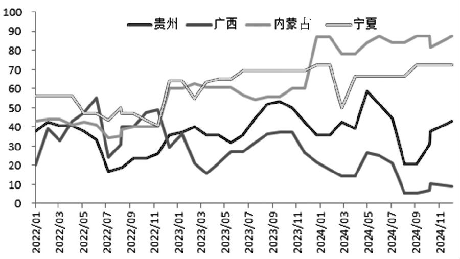 图为2024年内蒙古锰硅现货价格(单位:元/吨) 行业高利润难以为继 当前锰硅产业呈现产能过剩、需求年度下滑和行业高利润难以为继的状况,成本优势导致产量仍主要集中在北方地区。 据铁合金在线统计,2024年锰硅全国总产量约为1053.285万吨,较2023年减少11.78%。其中锰硅月度最高产量为6月的98.13万吨,最低产量为4月的71.11万吨。 受政策、成本等因素影响,北方主产区开工率整体维持相对高位运行,逐年有所抬升,南方主产区开工率则呈现逐步下滑态势。行业整体维持产能过剩状态。上周北方内蒙古新点火炉子产量仍在陆续提升,锰硅整体供应水平还在上涨。上周Mysteel统计全国187家独立锰硅企业样本开工率为45.29%,环比增长0.26%;日均产量为28740吨,环比增加405吨,创近5个月来新高。 此外,2024年四大主产区产量占比再度倾斜,广西年度产量仅占全国产量的3.56%,贵州年度产量占全国产量的6%,宁夏年度产量占全国产量的22.2%,内蒙古年度产量占全国产量的46.3%。