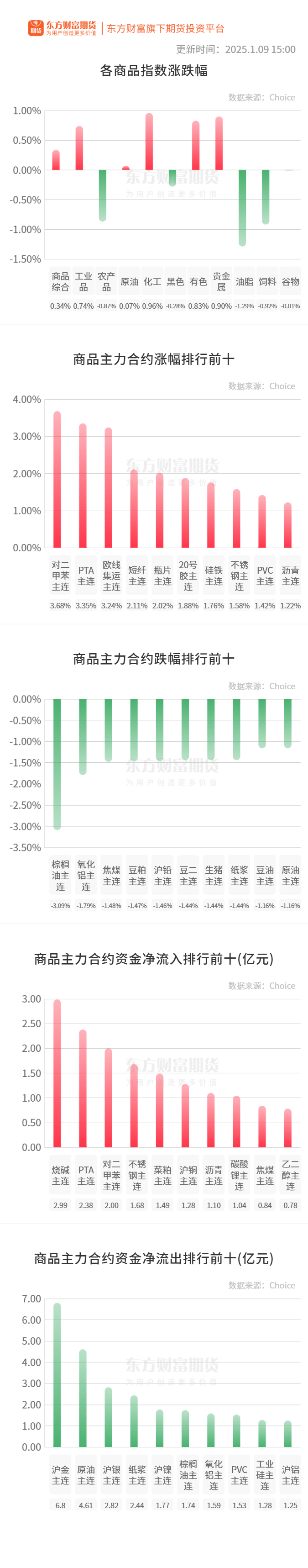 行情纵览![]() 宏观产经国家统计局:2024年12月份,全国居民消费价格(CPI)同比上涨0.1%,环比持平;全国工业生产者出厂价格(PPI)同比下降2.3%,环比下降0.1%。 央视新闻:总台记者当地时间1月8日获悉,加拿大政府已经拟就了一份针对美国候任总统唐纳德·特朗普关税威胁的美国商品清单。如果特朗普上台后对加拿大商品征收关税,加拿大将对从美国进口的商品征收报复性关税,包括美国的钢铁产品、陶瓷制品以及佛罗里达生产的橙汁等。 财联社:特朗普美东时间周二在佛罗里达州海湖庄园举行的新闻发布会上称,不排除使用经济或武力手段夺取格陵兰岛。他的这一表态令很多人感到担忧。特朗普为何会考虑夺取格陵兰岛呢?特朗普本人始终将此事与美国的“国家安全”绑定,本周三,即将担任特朗普政府国家安全顾问的迈克·瓦尔兹表示,格陵兰岛对美国的国家安全很重要,事关关键矿产,事关自然资源。 品种资讯黑色系期货 螺纹钢:据Mysteel,截至1月9日当周,螺纹钢产量、表需连续第三周减少,厂库由降转增,社库连续第二周增加。①螺纹产量199.41万吨,较上周减少6.6万吨,降幅3.2%;②螺纹厂库125.54万吨,较上周增加4.09万吨,增幅3.37%;③螺纹社库292.31万吨,较上周增加5.27万吨,增幅1.84%;④螺纹表需190.05万吨,较上周减少7.21万吨,降幅3.66%。(Mysteel) 铁矿石:1月9日统计新口径114家钢厂进口烧结粉总库存3133.74万吨,环比增34.40万吨;进口烧结粉总日耗111.95万吨,环比减0.42万吨;剔除长期停产样本后不含税铁水成本2513元/吨,环比减22元/吨。(Mysteel) 农产品期货 棕榈油:1月9日马来西亚棕榈油离岸价为1095美元,较上日跌15美元,进口到岸价为1125美元,较上日跌15美元,进口成本价为9879.41元,较上日跌123.61元,续刷逾2个月新低。进口利润为负239.41元/吨,较上日下跌106.39元/吨。(中国粮油商务网) 苹果:数据显示,截至2025年1月8日,全国主产区苹果冷库库存量为779.09万吨,环比上周减少18.04万吨,去库速度较上周有所加快,同比去年同期亦略快。(Mysteel) 白糖:巴西航运机构Williams发布的数据显示,截至1月8日当周,巴西港口等待装运食糖的船只数量为29艘,此前一周为33艘。港口等待装运的食糖数量为108.33万吨,此前一周为118.19万吨。(新华财经) 有色/贵金属期货 沪铜:截至1月9日周四,全国主流地区铜库存较周一下降1.01万吨至10.57万吨,较上周四下降0.86万吨,周度库存结束2连增重新下降。(SMM) 氧化铝:据SMM获悉,自1月9日起山东某大型氧化铝厂调整32%的离子膜液碱收货价格,在770元/吨的基础上上调20元/吨;即两票制出厂执行790元/吨(折百价约为2469元/吨)。(SMM) 多晶硅:2024年12月中国主流多晶硅企业多晶硅产量为10.3万吨,环比上月下降6.53%,同比2023年12月下降37.99%。预计2025年1月份多晶硅排产在9.1万吨左右,环比下降11.65%。(Mysteel) 能化期货 玻璃:本周玻璃样本企业库存继续下滑,截止到1月9日,全国浮法玻璃样本企业总库存4370.2万重箱,创农历春节以来最低,环比下降49.1万重箱或1.11%,同比增加37.01%。折库存天数20.3天,较上期-0.1天。(隆众资讯) 尿素:本周尿素产能利用率78.64%,环比跌0.35%。国内尿素企业库存大幅上涨,随着春节的临近,尿素企业春节收单陆续启动,但多数地区库存呈现上涨,下游刚需减弱的同时,下游储备补仓较为谨慎,尿素企业库存压力继续增加。截至2025年1月8日,中国尿素企业总库存量173.94万吨,较上周增加18.86万吨,环比增加12.16%。(隆众资讯) 纯碱:截至1月9日,本周国内纯碱厂家总库存147.08万吨,环比周增2.25万吨(增幅1.55%),较周一增加1.28万吨,涨幅0.88%。其中,轻质纯碱61.71万吨,环比增加0.08万吨,重质纯碱85.37万吨,环比增加1.20万吨。(隆众资讯) 晚间关注无 (文章来源:东方财富研究中心) (责任编辑:迷你学人) |