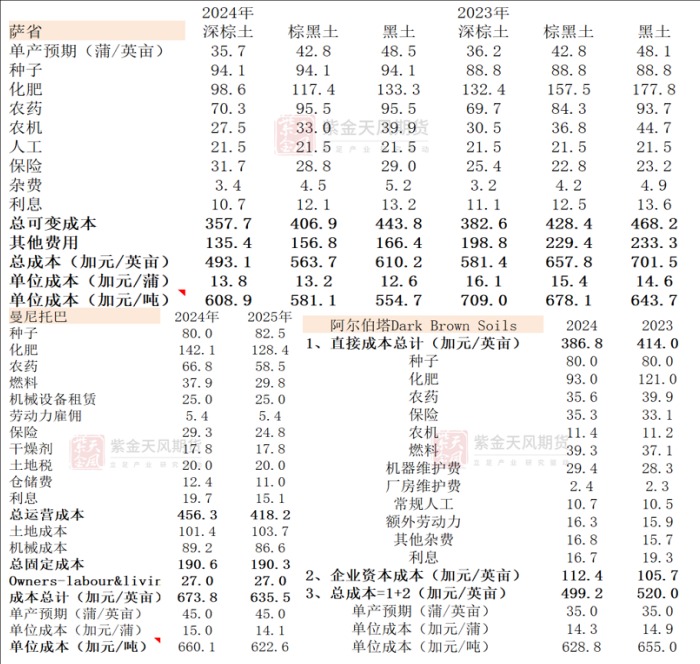 数据来源:ICE,紫金天风期货研究所 加拿大油菜籽的种植成本主要包括种子、化肥、农药、农机、人工、机械等等。不同省的统计方式有所差异,萨省的总成本等于可变成本加上其他费用,曼尼托巴的总种植成本等于运营成本加固定成本,而阿尔伯塔省的总种植成本等于直接成本加上企业资本成本。并且油菜籽种植成本在不同土壤类型下有所不同,例如萨省2024年种植成本在493加元/英亩-610.2加元/英亩区间,对应的单位成本在554加元/吨-609加元/吨区间。 图2:ICE菜籽期货收盘价