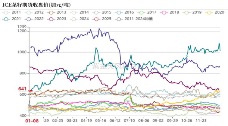 2024年12月下旬传中国对加拿大进口油菜籽反倾销裁定结果于12月底或年前落地。截至当前,市场看涨情绪降温后,裁定未有实质性进展。而2025年1月6日特朗普主张的对进口商品加关税态度,利空加拿大菜油、菜粕出口,市场担忧市场反倾销结果迟迟未落地,而美国的关税态度有可能致加拿大油菜籽副产品出口更多转向中国,近月到港的菜籽比此前预期的要更多,并且当前压港及压库的菜籽足够支撑榨到一季度末,近日国内菜粕盘面偏弱运行。加拿大作为全球主要油菜籽生产国及出口国,供需情况是全球菜系贸易的重要参考,ICE菜籽期货定价也是全球菜籽期货交易的基准。本篇主要对加拿大油菜籽成本及供需情况进行复盘。 加拿大油菜籽成本情况及ICE菜籽期货 ICE(Intercontinental Exchange)油菜籽期货(Canola Futures)是全球油菜籽市场的一个重要基准,其价格通常被用作现货市场以及其他地区油菜籽交易的定价基础。 图1:ICE菜籽期货收盘价