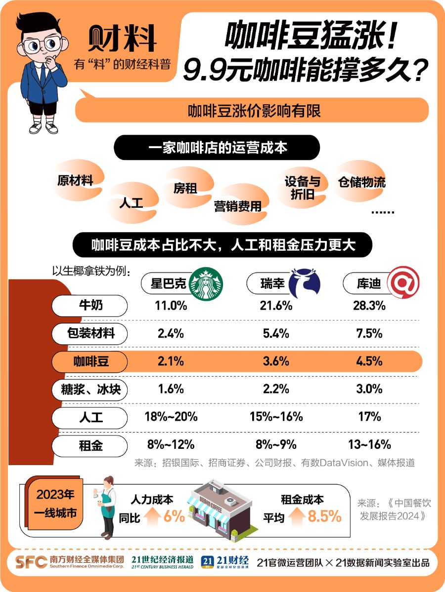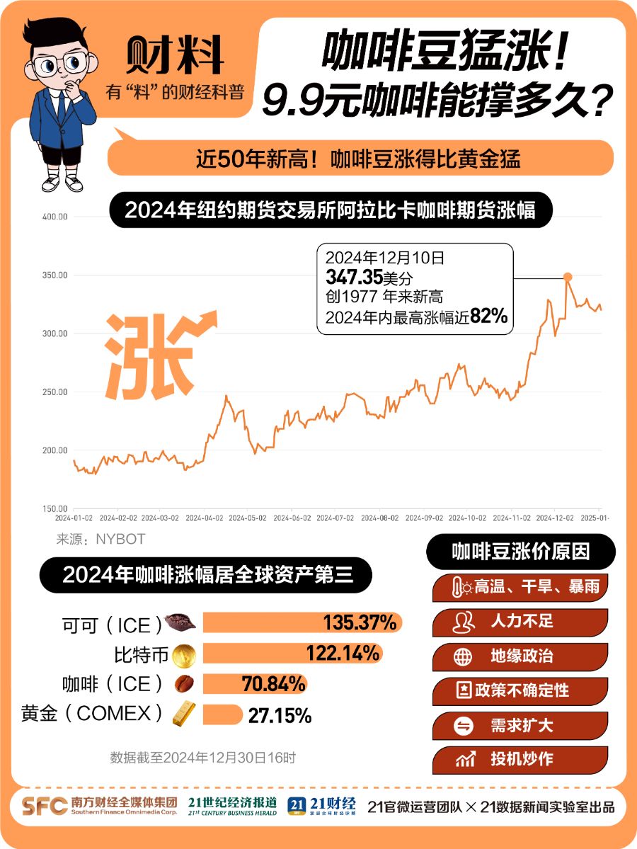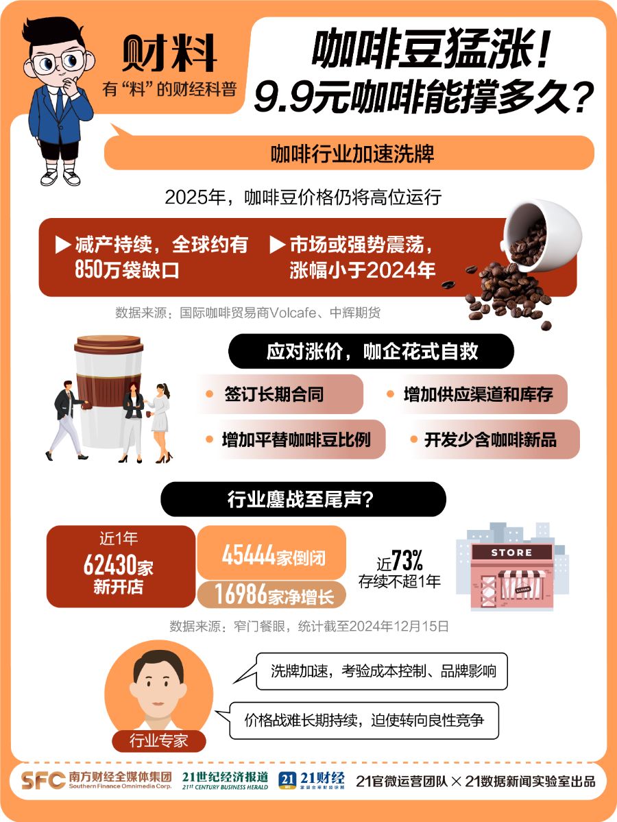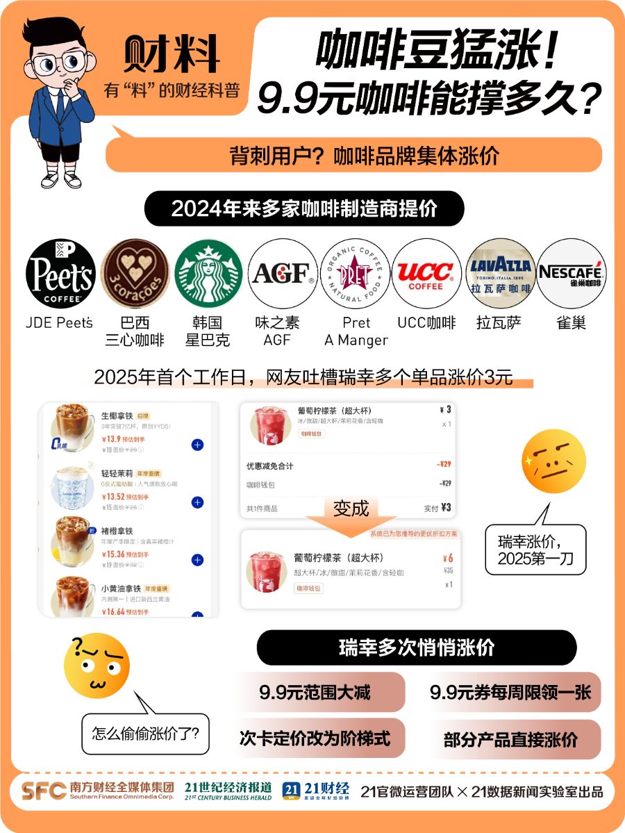 2025年刚开始,不少消费者发现瑞幸又涨价了!瑞幸客服对此表示,目前没有收到调价通知,具体价格请以APP显示为准。 2024年,咖啡豆期货价格一度创下近50年新高,涨幅远超黄金!但生豆价格波动,对国内终端市场影响或许有限。头部品牌可花式自救,但成本控制、品牌力较弱者或被加速淘汰。去年有超4.5万家咖企倒下,超过七成新开店没熬过一年。这或将迫使国内咖啡企业放弃单纯价格战,转向良性竞争。 你爱喝咖啡吗,有感觉到咖啡涨价不?本期《21财料》跟你聊聊打工人“续命水”背后那些事儿! ![]() ![]() ![]() ![]()