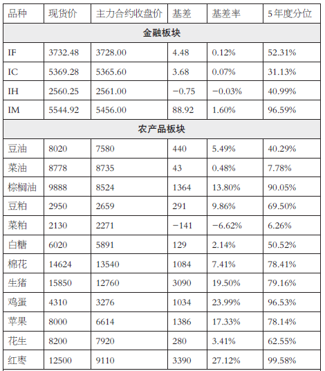 期货品种基差(1月10日) 迷你学人 01月13日 备注:1.生猪、鸡蛋、玻璃、铁矿石、焦煤已折合盘面相同单位价格;2.品种现货价采用交割基准地报价;3.基差=现货价格-期货价格;4.基差率=(现货价格-期货价格)/现货价格;5.基差监测为5年度分位,即当日基差在近5年的基差中的分布情况,若品种上市不足5年,则采用上市以来数据;6.若基差在统计区间上沿(85%以上),其大概率有缩窄可能,若基差在统计区间下沿(15%以下),其大概率有扩大可能。(福能期货 郑晓艳) (责任编辑:迷你学人)