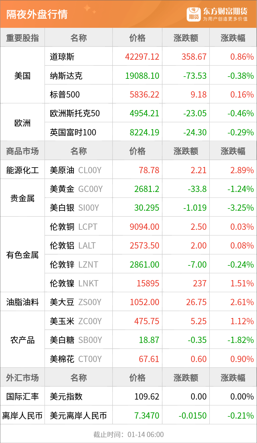 隔夜行情![]() ![]() 每日精选证监会:及时回应市场关切 进一步稳定市场预期 国内原油期货涨停!油价持续拉升 或干扰美联储决策? 增长5%!规模创历史新高!2024年我国进出口总值达43.85万亿元 宏观产经财联社:中国证监会召开2025年系统工作会议,总结2024年工作,深入推进巡视整改,研究部署2025年重点工作。会议要求,聚焦主责主业,着力提升监管执法效能和投资者保护水平。出台中小投资者保护政策措施文件,推动健全特别代表人诉讼、当事人承诺等制度机制,切实维护市场“三公”。 第一财经:全国检察长会议在京召开。其中提到,依法从严惩治严重经济犯罪,维护市场经济秩序。坚持和落实“两个毫不动摇”,对侵犯各种所有制经济产权和合法利益的行为实行同责同罪同罚。积极参与规范涉企执法专项行动,持续依法监督纠正违法“查扣冻”企业财产、违规异地执法和趋利性执法司法等突出问题。 央视新闻客户端:外交部发言人郭嘉昆主持1月13日举行的例行记者会。在回答有关美方将中国企业列入制裁名单的问题时,郭嘉昆表示,中方一贯反对美方泛化国家安全的概念,干扰和限制正常的经贸往来。中方一贯反对没有国际法依据、没有联合国安理会授权的非法单边制裁和长臂管辖。 品种资讯黑色系期货 钢材:1月上旬,21个城市5大品种钢材社会库存663万吨,环比增加4万吨,上升0.6%,库存低位波动;比上年同期减少118万吨,下降13.9%。螺纹钢库存250万吨,环比减少2万吨,下降0.8%,库存降幅收窄;比上年同期减少85万吨,下降23.8%。(中钢协) 截至1月13日一周,全国39个城市,共计147个仓库的城市钢材总库存量为597.23万吨,较上周环比增加1.40万吨,增幅0.23%。(钢银电商) 铁矿石:2025年01月06日-01月12日中国47港到港总量2416.3万吨,环比减少502.7万吨;中国45港到港总量2344万吨,环比减少490.3万吨;北方六港到港总量为1242.2万吨,环比减少136.2万吨。(我的钢铁网) 锰硅:截至1月10日当周,天津港港口锰矿库存为390.7万吨,环比减少32万吨;连云港港口锰矿库存量为0.5万吨;钦州港港口锰矿库存量为70.4万吨,环比减少4.5万吨。港口锰矿库存量总计为461.6万吨,较上期下降36.5万吨,为近半年来最低水平。(我的钢铁网) 农产品期货 豆油:截至1月10日,全国重点地区豆油商业库存89.4万吨,环比前一周修正后的93.25万吨减少3.85万吨,降幅4.13%。(我的钢铁网) 生猪:截至1月13日14:00,全国农产品批发市场猪肉平均价格为22.79元/公斤,比上周五上升0.8%。(农业农村部) 棉花:截止至1月9日,进口棉花主要港口库存周环比增4%,总库存52.68万吨。其中,山东地区青岛、济南港口及周边仓库进口棉库存约43.4万吨,周环比增2%,同比库存增2.1%;江苏地区张家港港口及周边仓库进口棉库存约5.93万吨,其他港口库存约3.35万吨。(我的钢铁网) 棕榈油:南部半岛棕榈油压榨商协会(SPPOMA)数据显示,2025年1月1-10日马来西亚棕榈油单产减少4.79%,出油率增加0.18%,产量减少3.84%。(新华财经) 有色/贵金属期货 沪铝:截至1月13日国内主流消费地电解铝锭库存45.50万吨,较上周四(1月9日)减少0.4万吨;国内主流消费地铝棒库存14.26万吨,较上周四(1月9日)增加0.56万吨。(上海有色网) 沪铜:1月13日上海、广东两地保税区铜现货库存累计1.46万吨,较6日降0.08万吨,较9日降0.18万吨; 上海保税区1.22万吨,较6日降0.08万吨,较9日降0.18万吨; 广东保税区0.24万吨,较6日持平,较9日持平;保税区库存小幅减少,近期仍有部分仓库货源清关进口至国内,且进口抵港到船货源偏少,库存因此下降。(我的钢铁网) 沪锌:截至1月13日,七地锌锭库存总量为6.10万吨,较1月6日降低0.07万吨,较1月9日增加0.30万吨,国内库存录增。三地库存均增长,周末广东地区到货较多,上海和天津国产锌锭长单也持续到货,而下游企业临近放假原料需求下滑,采买及提货减少下,三地锌锭库存环比录增。整体来看,原三地库存增加0.38万吨,七地库存增加0.30吨。(上海有色网) 氧化铝:2025年1月10日海外市场氧化铝成交3万吨,价格为西澳FOB610美元/吨或东澳FOB607美元/吨或印度/印尼FOB616美元/吨,货源由卖家选择,4月船期。另外,1月13日海外市场以巴西FOB672美元/吨成交3万吨,2月下旬船期,去向不知。(我的钢铁网) 能化期货 橡胶:截至2025年1月12日,青岛地区天胶保税和一般贸易合计库存量50.43万吨,环比上期增加0.42万吨,增幅0.84%。保税区库存6.32万吨,增幅1.12%;一般贸易库存44.12万吨,增幅0.80%。(隆众资讯) 烧碱:1月13日,山东市场液碱库存继续保持低位,部分企业散户出货暂可,重点关注近期送货量的变化以及主力下游采购价格的调整。鲁西南32%离子膜碱主流成交880-920;鲁中东部32%离子膜碱主流成交870-910,50%离子膜碱主流成交1460-1510;鲁北地区32%离子膜碱主流成交898-940;鲁南32%离子膜碱主流成交880-890。(单位:元/吨)(隆众资讯) 苯乙烯:截至1月13日,江苏苯乙烯港口样本库存总量5.05万吨,较上周期增2.8万吨,幅度增124.44%。商品量库存在3.4万吨,较上周期增1.9万吨,幅度增126.67%。(隆众资讯) 其他期货 欧线集运:截至2025年1月13日,上海出口集装箱结算运价指数(欧洲航线)报3258.68点,与上期相比跌3.8%。(上海航运交易所) 环球视野界面新闻:欧洲央行管委、芬兰央行行长雷恩(Olli Rehn)当地时间1月13日表示,不管美联储作何行动,欧洲央行都应继续降息。 财联社:美国10年期国债收益率向上触及4.80%,为2023年11月以来首次,日内涨2.4个基点。 每日关注![]() (