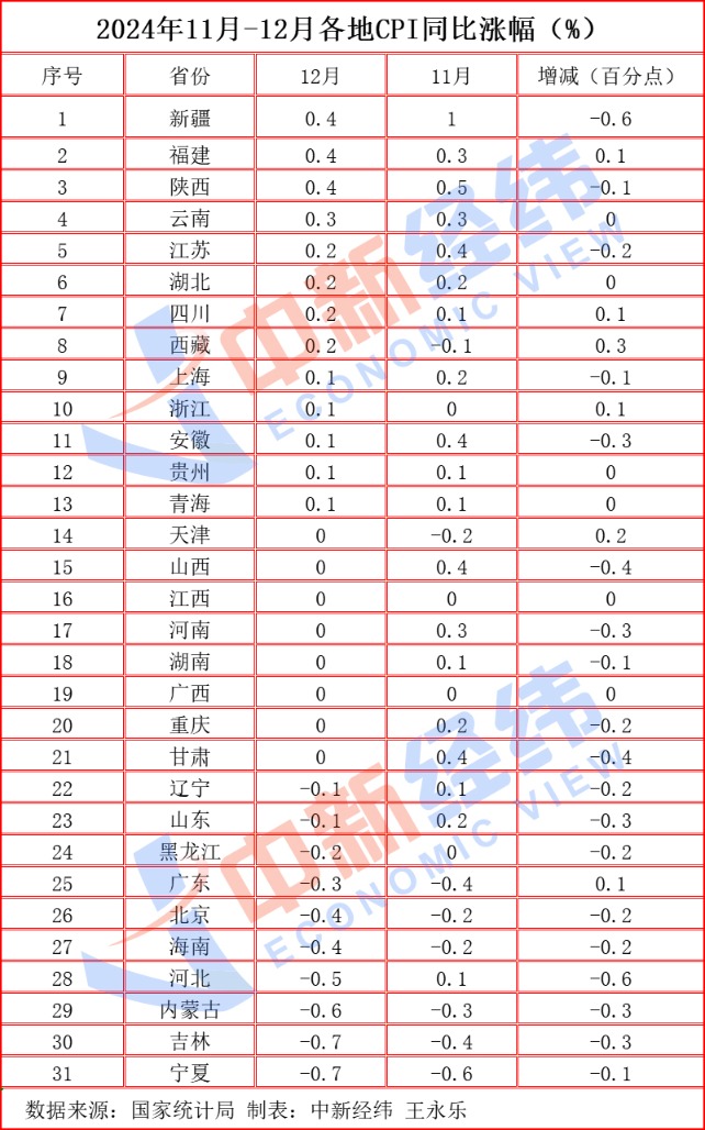 31省份2024年12月CPI出炉:13地上涨 宁夏“十连降”