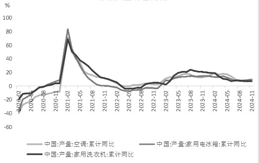 图为我国家电产量同比 房地产板块,2024年1—11月我国房屋竣工面积为48152万平方米,累计同比减少26.2%。通过推算,2024年前11个月地产板块对铜消费呈负反馈,较2023年同期减少约8.5万吨,去年全年为增加7万吨。 新能源领域,2024年新能源板块耗铜量未能延续2023年的高增长,有所放缓。电力方面,2024年1—11月全国主要发电企业电源工程完成投资8665亿元,累计同比增长12.34%。通过推算,2024年前11个月电源工程新增耗铜量约19万吨,累计同比增速12.34%,不及2023年全年的34.23%。2024年1—11月全国新增发电装机容量为32.3亿千瓦,同比增长14.4%,其中太阳能发电装机容量约8.2亿千瓦,同比增长46.7%,风电装机容量约4.9亿千瓦,同比增长19.2%。 汽车方面,2024年1—11月我国汽车产量为2790.3万辆,累计同比增长2.9%,其中新能源汽车产量为1134.5万辆,同比增长34.6%,新能源汽车市场占有率增至40.3%。通过推算,2024年前11个月新能源汽车耗铜量较2023年同期增加约20万吨,传统汽车耗铜量减少约5万吨,汽车行业总的耗铜增速为13.75%,低于2023年全年的19.26%。 关注出口政策变化 关税方面,美国当选总统特朗普竞选期间主张对我国出口商品征收60%关税,当选后曾称将对进口自中国的所有商品额外征收10%的关税。从我国铜出口情况来看,2023年我国对美国出口铜材及铜制品仅3.77万吨,占总出口量的5%。另外,由于此前美国对华商品征收多轮关税,铜涉及的终端产品对美国出口占比较小。2023年我国出口至美国的主要终端产品耗铜量预计为35.9万吨。若美国对我国产品征收关税,对铜消费影响量级的中性预期为1.1万吨。 出口退税方面,2024年11月15日财政部和税务总局发布公告,取消铜材产品出口退税,自2024年12月1日起实施。此次取消出口退税的铜材,2023年出口量为56.64万吨,占铜材出口总量的83.6%。由于国内加工贸易免征进口环节增值税,退税主要涉及国内增值部分,因此取消出口退税主要影响一般贸易出口方式。2023年我国一般贸易方式出口铜材共计34.12万吨,占铜材总产量的1.5%,占国内消费的2.35%。据上海有色网测算,参照2019年的出口比例,预计2025年进料及来料加工占比重回75%,再考虑比价影响,预计2025年铜杆、铜丝出口量同比下降8万吨,铜管及板带箔出口下降13万吨,预计2025年铜材总出口量下降21万吨,约占需求的1.4%。 2024年以来LME铜库存持续攀升,自5月的10万吨左右增至8月底的32万吨附近,9月、10月去化至27万吨附近,随后高位徘徊。而国内库存波动亦较大,2024年上半年由年初的7万吨一度增至45万吨,下半年快速去化,现在在10万吨左右。