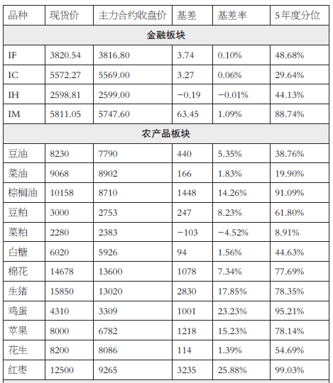 期货品种基差(1月14日) 迷你学人 01月15日 备注:1.生猪、鸡蛋、玻璃、铁矿石、焦煤已折合盘面相同单位价格;2.品种现货价采用交割基准地报价;3.基差=现货价格-期货价格;4.基差率=(现货价格-期货价格)/现货价格;5.基差监测为5年度分位,即当日基差在近5年的基差中的分布情况,若品种上市不足5年,则采用上市以来数据;6.若基差在统计区间上沿(85%以上),其大概率有缩窄可能,若基差在统计区间下沿(15%以下),其大概率有扩大可能。(福能期货 郑晓艳) (责任编辑:迷你学人)