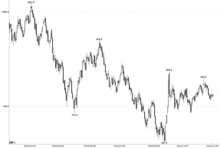 产能进入新一轮增长周期 2025年,铁矿石供应步入新一轮增长周期,而需求则处于下行周期之中,铁矿石供需预计将延续2024年的宽松状态。在供需宽松的环境下,铁矿石价格重心大概率继续下移。 A矿业投资持续增长,矿山产能逐步释放 2024年,铁矿石基本面发生逆转,价格也随之由强转弱,彻底抛去往日“强势”的标签。一季度,铁矿石期货价格从1000元/吨跌至750元/吨;二季度,随着钢厂逐渐复产,铁矿石需求边际改善,价格再度反弹至900元/吨上方;三季度,受到下游需求疲弱以及自身库存持续增加的双重压力,价格一路跌至650元/吨的低位水平;四季度,在宏观层面利好频出的情况下,价格再度大幅反弹至850元/吨附近。从全年走势来看,铁矿石价格重心不断下移。2025年,铁矿石行情将会如何演绎?