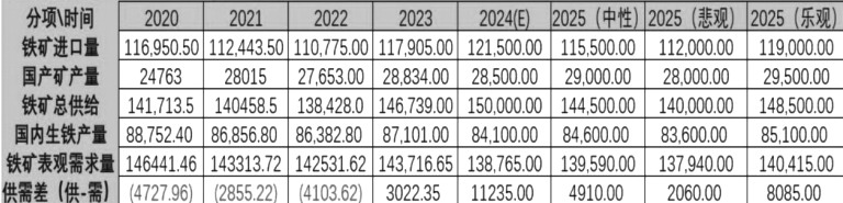 图为全国铁矿石原矿产量(单位:万吨) 2025年,钢铁行业预计仍将面临较大的生产经营压力,同时政策引导钢厂控制产能的意图也越发明确。在此环境下,预计国内生铁产量大概率会维持2024年的水平。中性预期下,生铁产量将增长500万吨;乐观预期下,生铁产量将增长1000万吨;悲观预期下,生铁产量将下降500万吨。 C2025年铁矿石供需展望 综合上述分析,我们对2025年铁矿石供需状态做了三种情景假设,分别为:中性、乐观以及悲观。基于中性假设,全年铁矿石供需过剩4900万吨左右;基于乐观假设,全年供需过剩8000万吨左右;基于悲观假设,全年供需过剩2000万吨左右。整体来看,三种预期假设情景下,铁矿石供需均呈现过剩状态。