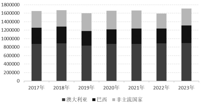 图为全球铁矿石新增项目产能及投产时间 除西芒杜项目外,澳洲、巴西及非洲还有多个铁矿石项目正在开发之中。比如,力拓集团和中国宝武共同投资的澳洲西坡项目,预计于2025年投产,满产产能为2500万吨/年。巴西欧亚资源集团投资开发的BAMIN铁矿石项目,预计于2027年投产,设计年产能2700万吨。巴西Samarco Mineracao投资开发的Mina Germano矿山项目,设计年产能2000万吨,预计于2025年逐步投产。另外,还有中资企业在非洲阿尔及利亚投资的Gara Djebilet铁矿石项目,预计于2026年投产,设计年产能2500万吨。上述矿山项目投产之后,预计每年带来的新增铁矿石产能达2亿吨。 世界钢铁协会最新发布的数据显示,2023年全球铁矿石出口量总计达到17.1亿吨。其中,澳大利亚铁矿石出口量为8.98亿吨,约占全球铁矿石出口量的52.5%;巴西铁矿石出口量为4.08亿吨,约占全球铁矿石出口量的23.9%;非主流国家铁矿石出口量为4.05亿吨,约占全球铁矿石出口量的23.7%。