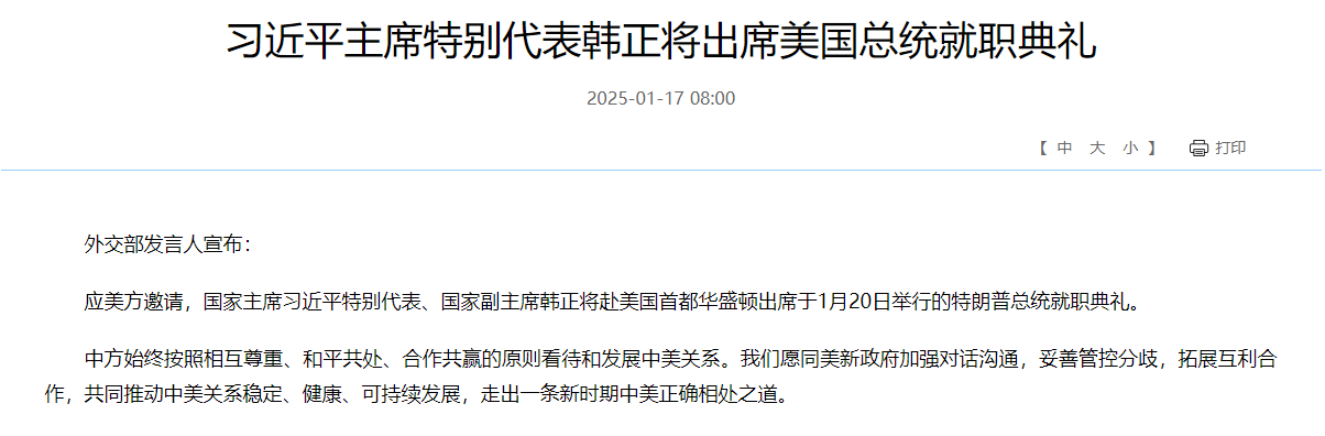 习近平主席特别代表韩正将出席美国总统就职典礼 外交部网站 01月17日 外交部发言人宣布: 应美方邀请,国家主席习近平特别代表、国家副主席韩正将赴美国首都华盛顿出席于1月20日举行的特朗普总统就职典礼。 中方始终按照相互尊重、和平共处、合作共赢的原则看待和发展中美关系。我们愿同美新政府加强对话沟通,妥善管控分歧,拓展互利合作,共同推动中美关系稳定、健康、可持续发展,走出一条新时期中美正确相处之道。(文章来源:外交部网站) (责任编辑:迷你学人)