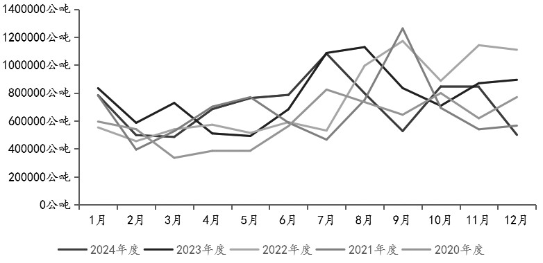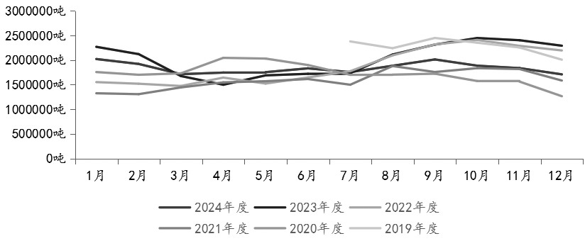 印度棕榈油进口量(季节性) 印度对棕榈油的需求下降。印度溶剂萃取商协会(SEA)表示,印度2024年12月棕榈油进口量较11月下降41%,原因是棕榈油价格上涨至两年半以来的高点,促使精炼厂商增加价格更便宜的豆油的购买量。SEA称,由于供应紧张导致马来西亚棕榈油出口量下降,消费者转向购买南美豆油,棕榈油在印度的市场份额正在被更便宜的豆油抢占。 对比近五年的数据可以发现,马来西亚2024年12月的棕榈油产量接近平均水平,并不算低。由于其油棕树老龄化现象越来越严重,2024年12月棕榈油产量达到148.7万吨较为不易。由于出口量大幅回落,马来西亚2024年12月棕榈油期末库存量达到170.8万吨。并且降雨量过多影响的只是收割节奏,总产量并不会受到较大影响,一旦天气恢复正常,马来西亚棕榈油产量将有所提升。总体看,马来西亚棕榈油供应并不紧张。