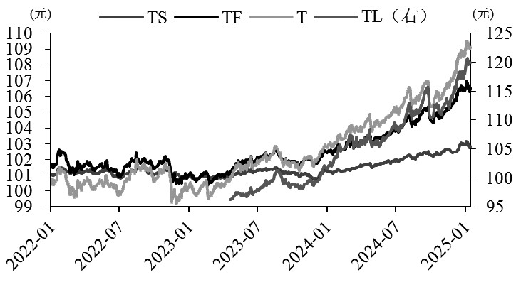 春节前,政策仍处于真空期,期债仍有望维持上涨趋势。近期长期限品种表现更佳,短期限品种性价比再次凸显,建议多头投资者关注短期品种的配置性价比。 今年1月以来,国债期货呈现有波折的上涨态势,创年内新高后受阻回落,目前TL再度接近历史新高。具体而言,截至1月14号,TL主力合约月涨1.5%,T主力合约月涨0.38%,TF主力合约月涨0.02%,TS主力合约月跌0.14%。1月品种间价差走势呈现持续收缩的态势,4TS-T和2TF-T价差整体均显著回落,反映1月长期限合约表现更佳,做平利率曲线的策略思路仍延续。 1月10号,央行于官网发布暂停国债买入操作的信息。央行暂停买入国债意味着在前期多次提示风险并采取相应监管措施后,对债市的调控力度升级加码,旨在遏制近期债市收益率快速下行的“抢跑”势头,稳定市场预期,同时也有助于稳定人民币汇率。这意味着国债收益率未来的下行趋势将不再如此前那般顺畅,基于该预期,机构投资者持续买债的行为将得到显著约束,短期债市出现一定调整。 1月14日国新办举行“中国经济高质量发展成效”系列新闻发布会,介绍金融支持经济高质量发展有关情况,释放对债市偏利好的政策信号,央行官员强调将综合施策扩展利率政策空间,实现推动社会综合融资成本下降的目标,预示降准降息将要落地。同时,强调投资国债并非没有风险,央行暂停国债买入是为了避免市场波动,并非单方面打压债市。另外,1月资金面有一定波动,1月14日隔夜回购利率日内一度大幅上冲反映市场对春节前资金面的担忧情绪较重,对短债的负面冲击十分明显,使得TS表现明显弱于其余品种。