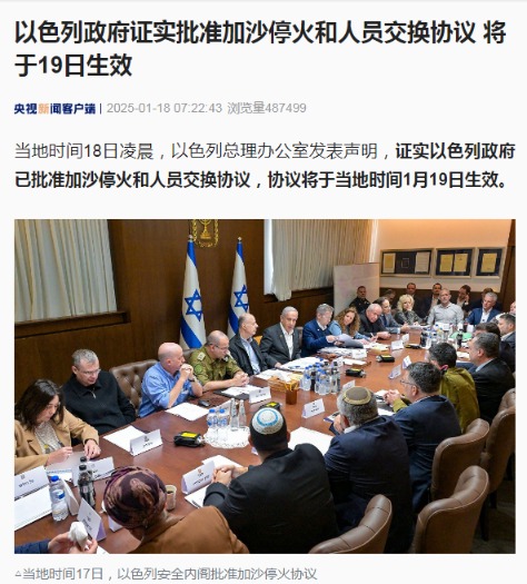 据央视新闻,当地时间1月18日凌晨,以色列总理办公室发表声明,证实以政府已批准加沙停火和人员交换协议,协议将于当地时间1月19日生效。 ![]() 图片来源:央视新闻 当地时间17日,以色列安全内阁经会议投票,批准了加沙地带停火和被扣押人员交换协议。协议在以色列安全内阁和政府部长全体会议进行投票表决通过后才可生效。