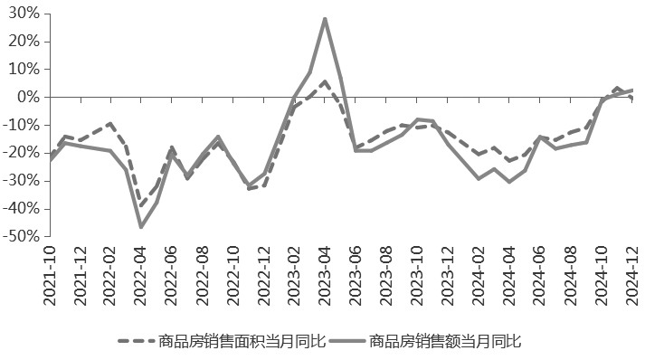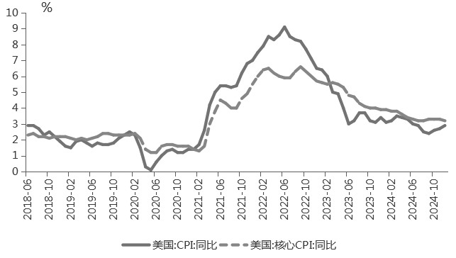 图为商品房销售面积和销售额同比走势 美联储降息预期提升 美国去年12月CPI符合预期,但核心CPI同比、环比增速均放缓。其中,CPI同比增长2.9%,前值2.7%,核心CPI同比增长3.2%,低于预期和前值值;CPI环比增长0.4%,符合预期,核心CPI环比增长0.2%,低于预期和前。CPI整体回升主要受能源价格上行的推动。去年12月美国能源价格环比增长2.6%,前值0.2%;食品价格环比增长0.3%。前值0.4%;核心商品环比增长0.1%,前值0.3%,二手车价格环比连续4个月增长,对核心商品通胀形成拉动。房租价格环比增速持平(0.3%),但主要居所租金和业主等价租金环比增速均从0.2%反弹至0.3%,外出住宿环比增速从3.2%回落至-1%,对房租分项有一定拖累。超级核心通胀环比增速回落,医疗保健、外出住宿、休闲服务环比增速放缓是主要下行驱动。去年12月美国超级核心通胀环比增长0.21%,前值0.34%,同比增长4.05%,前值4.25%,其中医疗保健环比回落至0.2%,休闲服务价格环比回落至0.4%,运输服务环比增长0.5%,前值0%。 此前市场担忧特朗普政策增加通胀风险,同时美国就业数据超预期,导致再通胀预期升温,美元指数和美债利率均大幅走高。在2024年12月通胀数据公布后,美元指数和美债利率回落,再通胀担忧缓和,美联储降息预期回升。目前市场预期2025年美联储降息次数回升至1.5次。特朗普政策落地及传导存在一定时滞性,预计二季度之后特朗普政策对通胀的扰动将逐步显现。短期看,1月20日特朗普就任,海外不确定性逐步下降,市场对中美关系改善的预期也在升温,带动市场风险偏好回升。