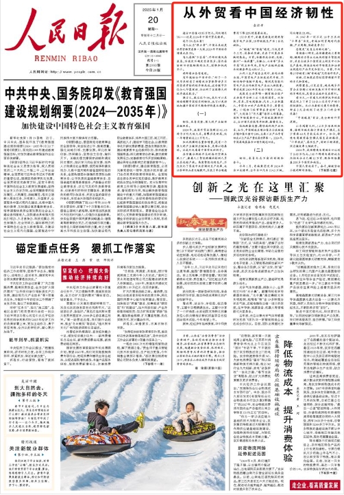(一) 韧性,来自完整、强大的产业链供应链体系。 2024年,我国外贸连续跨过42、43两个万亿元级大关,再攀历史新高,仅一年增量就达2.1万亿元。 如此规模的总量和增量,没有一个强大的产业链供应链体系,是难以想象的。让我们先看看中国家电的例子。 在安徽合肥经开区的海尔空调互联工厂,戴着人工智能眼镜的检测人员正在巡检产线。高度智能化的生产,不仅优化了家庭中央空调的生产效率,也让零部件品质大幅提升,实现了单台制造费用下降22%的显著成效。 150公里外,安徽芜湖美的厨热智能家电产业园,18秒就能生产出1台洗碗机。 从“制造”向“智造”进发,不仅是单个工艺、设备的突破,更在于对复杂系统的集成。目前,安徽形成合肥、芜湖、滁州“一体两翼”,马鞍山、六安等“多点开花”的互补布局,家电产业链供应链本地配套率达60%以上。 从代工生产到自主设计,再到品牌出海,中国家电产业快速迭代升级,不断迈向价值链中高端。特别是智能化家电产品为传统家电产业注入新能量,带动我国2024年家电出口增长15.4%。 我国是全世界唯一拥有联合国产业分类中全部工业门类的国家。从纺织、家具、家电到船舶、汽车、工业机器人,中国出口的产品种类齐全、质量过硬。小到出门经常带在身边的“充电宝”,大到海上“巨无霸”海洋工程装备,国际市场需要什么,中国就能提供什么,出口增长动能有序转换、接替发力。 依托配套完整、持续迭代的产业体系,如今,中国制造业增加值占全球制造业增加值比重约30%,主要工业产品中有四成以上产品产量位居世界第一。2024年,中国高端装备出口增长超过四成。 (二) 韧性,来自矢志不渝的创新和奋斗。 今年1月,奇瑞集团发布2024年出口成绩单:全年出口汽车114.5万辆,同比增长21.4%。 从1997年一间不足10平方米的“小草房”出发,奇瑞如何穿越时代浪潮、产业周期,保持竞争力? 答案是“走自主创新之路”。 奇瑞潜心研发,逐渐搭建起火星架构、鲲鹏动力等五大板块的整车智能闭环,并在全球多个国家设立研发中心和生产基地,根据当地的市场需求和法律法规进行产品开发和优化。目前,平均每27秒就有1辆“奇瑞造”交付海外用户。 创新,还体现在因时因势调整外贸的方式和策略。 洞察需求,以变应变,越来越多外贸企业坚持以创新发展对冲外部环境的不确定性,民营企业始终走在前列。 前不久,一家意大利科萨托市的客商在网上下单了50台山东济宁产的小型挖掘机。本以为要经过漫长的等待,却在3天后收到了送货上门的全部设备! “中国速度”背后,是全新的外贸逻辑。 山东到意大利,1.2万多海里的距离,按照传统先接订单再生产模式,至少需要60天才能完成出口。如今,跨境电商提前备货模式催生崭新路径,“小单快反”、柔性生产,创新不断涌现,供应链效率大幅跃升。 2024年,我国跨境电商进出口达到了2.63万亿元,165个跨境电商综试区内相关企业已超12万家,服务网络覆盖200多个国家和地区。 中国人崇尚实干。奋斗,铸就坚韧不拔的鲜明性格。 “中国人民自古就明白,世界上没有坐享其成的好事,要幸福就要奋斗。” “中国式现代化的新征程上,每一个人都是主角,每一份付出都弥足珍贵,每一束光芒都熠熠生辉。” 这光芒,也来自每一个中国企业、中国企业家的创新和奋斗。 (三) 韧性,来自“和合共生”“同球共济”的共赢理念。 “各国一起发展才是真发展,大家共同富裕才是真富裕”“以和合共生的愿景凝聚发展合力”“让‘同球共济’、团结协作、互利共赢成为时代主旋律”…… 中国是这样说的,也是这样做的。 1月1日,中国—马尔代夫自贸协定正式生效。次日,喜临门家具股份有限公司就向绍兴海关申领了原产地证书。凭借这份原产地证书,企业当次出口的弹簧床垫可在马尔代夫获得近1万元的关税减让。 去年12月1日,我国给予所有已建交的最不发达国家100%税目产品零关税待遇,带动当月自相关国家进口增长18.1%,较前11个月加快5.8个百分点。 中国外贸是普惠的。 坚持倡导普惠包容的经济全球化,有序扩大自主开放和单边开放,中国以真挚态度和务实合作交朋友,“朋友圈”遍布世界各地,国际市场此消彼长,“东方不亮西方亮”。 2024年,我国对联合国统计分组中几乎全部国家和地区都有进出口记录,对160多个伙伴实现进出口增长。 中国外贸是绿色的。 2024年,中国风力发电机组出口增长71.9%,光伏产品连续4年出口超过2000亿元,锂电池出口39.1亿个。中国绿色产品不仅丰富了全球供给,也为全球应对气候变化和绿色低碳转型作出了巨大贡献。 2024年,我国电动汽车出口量首次突破200万辆。俗话说“条条大路通罗马”,如果把这些汽车首尾相连,可以从北京到罗马。 中国市场是共享的。 2024年,中国进口18.39万亿元,预计继续保持第二大进口国地位。中国超大规模市场潜能,不只在于人口规模之大,更在于消费增长之迅速、需求层次之丰富,在供需良性互动中持续释放巨大潜力。 《巴基斯坦观察家报》刊文指出,当中国出口时,它支撑着横跨各大洲的供应链;当它进口时,预示着境外企业的机会。 新加坡《联合早报》认为,超大规模市场、丰富的场景需求、完善的产业配套体系,这些因素成为外资外企坚定看好中国的重要原因。 进入2025年,我国有序扩大自主开放和单边开放,超大规模市场潜力持续释放,不仅为外贸高质