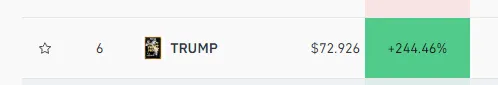 TRUMP暴涨 而币圈另一则值得关注的消息是特朗普推出的Meme币TRUMP。 当地时间1月18日,特朗普在其社交账号上发文,宣布推出个人Meme币TRUMP,用户需访问域名为“gettrumpmemes”的网站以获取该Meme代币,该网站显示,TRUMP是唯一的“官方特朗普Meme币”。 ![]() 该虚拟货币推出之后大火,该币的开盘价为0.1824美元,截至发稿,TRUMP涨破70美元,也就是说,自开盘以来,TRUMP涨幅约为40000%。 ![]() 有分析称,特朗普直接下场“发币”模糊了政府角色与商业利益之间的界限,并且80%的TRUMP币由特朗普集团自有,其本质是在“利用总统职位牟利”;同时也有观点称,TRUMP币的发行标志着政治meme币市场的开启,该代币在去中心化交易所发行也是对币圈生态的一大创新,看好 “链上之春” 的爆发。 (文章来源:证券时报) (责任编辑:迷你学人) |