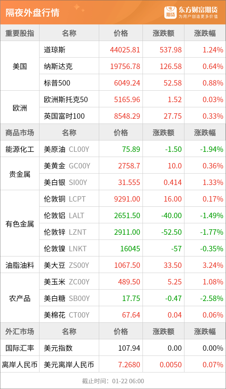 隔夜行情![]() ![]() 每日精选特朗普称将针对中国贸易行为进行调查 中方回应 特朗普签令:调查拜登政府!“退群”、加关税、将“墨西哥湾”更名为“美国湾” 12个鸡蛋64元!美国出现“蛋荒” 价格创历史新高! 宏观产经新华社:1月21日下午,国家主席习近平在北京人民大会堂同俄罗斯总统普京举行视频会晤。两国元首还就共同关心的国际地区问题深入交换意见,同意在新的一年里继续保持战略沟通。 财联社:工信部相关负责人在“中国经济高质量发展成效”系列新闻发布会上表示,下一步,将聚力推动存量政策和增量政策落地见效,促进工业经济持续平稳向好。启动实施新一轮十大重点行业稳增长工作方案。加力推进大规模设备更新和消费品以旧换新,着眼“十五五”谋划推出一批重大投资项目。 商务部:商务部副部长兼国际贸易谈判副代表凌激主持召开欧洲企业圆桌会,听取在华欧企问题建议。财政部、国家药监局等部门代表参加会议。与会代表表示,愿为进一步深化中欧经贸合作贡献力量,反对与中国脱钩断链,愿长期深耕中国市场,共享发展机遇。 品种资讯黑色系期货 钢材:21日全国300家长、短流程代表钢厂废钢库存总量713.68万吨,较昨日增3.86万吨,增0.54%;库存周转天10.8天,较昨日持平;日消耗总量44.33万吨,较昨日降1.29%;日到货总量48.19万吨,较昨日降1.17%。(我的钢铁网) 铁矿石:1月21日Mysteel统计中国47港进口铁矿石库存总量15547.81万吨,较上周一下降121.35万吨。具体区域来看,本期华东、华南、沿江三个区域港口库存较上周一均呈现不同程度的去库;而华北区域港口库存有所增加,东北区域港口库存基本持稳运行。(我的钢铁网) 焦煤:中钢协发布关于发布焦煤长协煤钢联动浮动值(试行)的通知,其中指出,方案按月采集经市场检验、专家认定的煤钢焦第三方机构价格信息,结合期货数据,加入权重设计,综合计算得出月度和季度均值环比变化。模型权重设置以焦煤现货为核心,考虑产业链协同发展、各成本占比等因素,将焦煤现货权重设置为75%,钢材现货权重设置为15%、焦炭现货权重设置为5%,煤钢焦期货权重设置为5%。(新华财经) 农产品期货 棉花:据国家棉花市场监测系统的抽样调查显示,截至2025年1月初,被抽样调查企业棉花平均库存使用天数约为34.9天(含到港进口棉数量),环比减少0.1天,同比增加1.4天,比近五年同期平均水平增加1.7天。测算全国棉花工业库存约76.5万吨,环比减少0.3%,同比增加9.6%,比近五年同期平均水平增加7.5%。(中储棉信息中心) 大豆:巴西植物油行业协会(Abiove)发布的最新预测显示,2025年巴西大豆产量将达到创纪录的1.717亿吨,较前一月预测增加300万吨;出口量将达到1.061亿吨,较2024年增长7.4%,并创下历史新高。 棕榈油:机构调查显示,2025年马来西亚棕榈油产量预测为1950万吨,同比增长0.83%。2025年印尼棕榈油产量预计为4980万吨,同比增长1.9%。(财联社) 南部半岛棕榈油压榨商协会(SPPOMA)数据显示,2025年1月1-20日马来西亚棕榈油单产减少8.43%,出油率减少0.26%,产量减少9.8%。(新华财经) 有色/贵金属期货 沪铜:记者21日从中国有色金属工业协会获悉,2024年我国规模以上有色金属企业工业增加值同比增长8.9%,十种有色金属产量7919万吨,比上年增长4.3%。其中,精炼铜、电解铝产量分别达1364万吨、4400万吨,同比增长4.1%、4.6%。(新华社) 黄金:Phillip Nova的分析师表示,由于对关税和其他变化的预期被推后,黄金投资者急于锁定收益。但不确定性导致美元出现回调,而美元走弱和稳定的交易量为黄金提供了动力。展望未来,避险情绪将推动黄金的看涨势头,未来几周可能不仅仅只是简单的“出现波动”。(新华财经) 氧化铝:近日河南地区氧化铝3950元/吨成交0.5万吨现货,氧化铝厂出电解铝厂,流向四川;贵州地区4300元/吨成交0.3万吨,贸易商出电解铝厂,流向四川。(我的钢铁网) 广西地区铝厂采购氧化铝现货1万吨,到厂价格4300元/吨,山西货源。(SMM) 能化期货 PTA:进入2025年以来,在多因素影响下,石化行业重要的原料和前端产品——石脑油价格正经历一波较大幅度上涨。卓创资讯数据显示,1月初以来,山东地炼石脑油价格呈现连续上涨后略有下调的局面。其中,1月中旬上涨势头强劲,1月11日当天的单日涨幅更是创下近5年来最高。分析师表示,此轮地炼石脑油价格出现拉涨,主要受成品油市场影响,预计1月下半月会出现回调。(财联社) 原油:当地时间1月21日,沙特阿美CEO阿明·纳赛尔接受媒体采访称,预计今年全球石油需求将增加约130万桶/日,达到1.06亿桶/日。纳赛尔表示,“良好”的中国需求仍在推动全球石油需求增长,“中国和印度占全球石油消费增长的近40%份额,需求正逐年增加”。(界面新闻) 新上任的美国总统特朗普1月20日宣布签署一系列行政令。其中,能源领域包括宣布国家能源紧急状态,加大传统能源开采,结束拜登政府“绿色新政”,撤销电动车优惠政策以拯救美国传统汽车工业。(界面新闻) 环球视野新华网:俄罗斯外交部副部长里亚布科夫21日在接受采访时表示,希望美国总统特朗普尊重巴拿马运河现行国际法律制度。 财联社:加拿大12月CPI同比增长1.8%,预期增长1.9%;12月CPI环比下降0.4%,预期下降0.4%。掉期市场预计加拿大央行本月将降息25个基点的概率为83%,高于CPI数据公布前的78%。 每日关注无 (文章来源:东方财富研究中心) (责任编辑:迷你学人) |