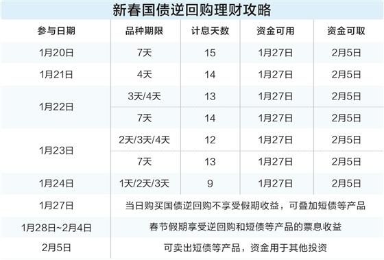 ![]() 临近春节,又到了操作国债逆回购挣过节红包的时候。近日,国债逆回购年化收益率大幅飙升,1天期品种甚至一度突破4.1%。结合春节放假安排,如果在1月24日投资1天期的国债逆回购,就可以赚到9天的利息。 不少券商已行动起来,相继推出了“国债逆回购+短债/短融ETF”等组合投资攻略,并称可“一份本金,两份收益”。有的券商还推出了新春短期理财产品,约定年化收益率高达5%。不过,相较往年,当下参与发售新春短期理财产品的券商似有减少,分析人士称这主要受到了资金成本、投入产出比以及收益凭证新规等因素的影响。 一天“躺赚”九天利息 国债逆回购是一种短期理财方式。通常来说,融资方一般是金融机构,交易对手是结算中心,如果融资方到期不能按时还款,结算中心会先垫付资金,因此风险比较低。 国债逆回购也是只有交易日开市,交易时间为9:30~11:30、13:00~15:30。沪深两市国债逆回购都是1000元起投,以1000的整数倍进行申报购买。手续费是每10万元1天收费1元(十万分之一),按天计息,30元封顶,不收取印花税、规费、过户费。 按照规则,国债逆回购的交易品种分为1天、2天、3天、4天、7天等,实行T+0清算、T+1交收制度,不过计息天数为资金实际占用天数。也就是说,只要操作得当就可以享受春节期间的收益。最重要的是,每逢月末、年末,国债逆回购的收益率大概率会上升,比如1月20日下午3时许,1天期实时年化收益率一度突破4.1%。 根据春节放假安排,1月28日(星期二)至2月4日(星期二)休市,投资者可在1月24日(本周五)下午三点半前操作完毕国债逆回购。如果投资者在1月24日当天投资1天期的国债逆回购,可以赚到9天的利息;如果在1月23日当天做2/3/4天期的国债逆回购,则可以享受12天的利息。 需要说明的是,国债逆回购的年化收益率是实时变动的,因此可以分批下单,看准心仪的利率即可出手。如今,各家券商的国债逆回购交易界面都非常成熟,系统会自动显示计息天数、预计收益、可用可取时间。 一份本金,如何两份收益? 如前所述,国债逆回购是T+1交收,即到期当日,账户资金不能转回银行卡,按照交易制度仍为占用状态,直至T+1日后才会结束。举个例子,1月24日(星期五)投资1天期的国债逆回购,1月27日(星期一)资金回到账上,但并不能直接转回银行卡。 因此,每逢节假日,不少券商也抓住机会推出相应的国债逆回购组合投资攻略。总体来看,如果要享受“一份本金,两份收益”,可以在国债逆回购的投资本金占用期间,认购可以享受票息收益的品种。