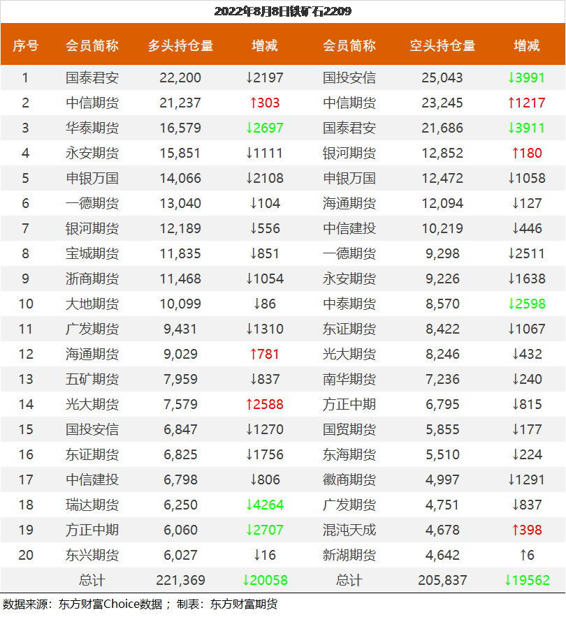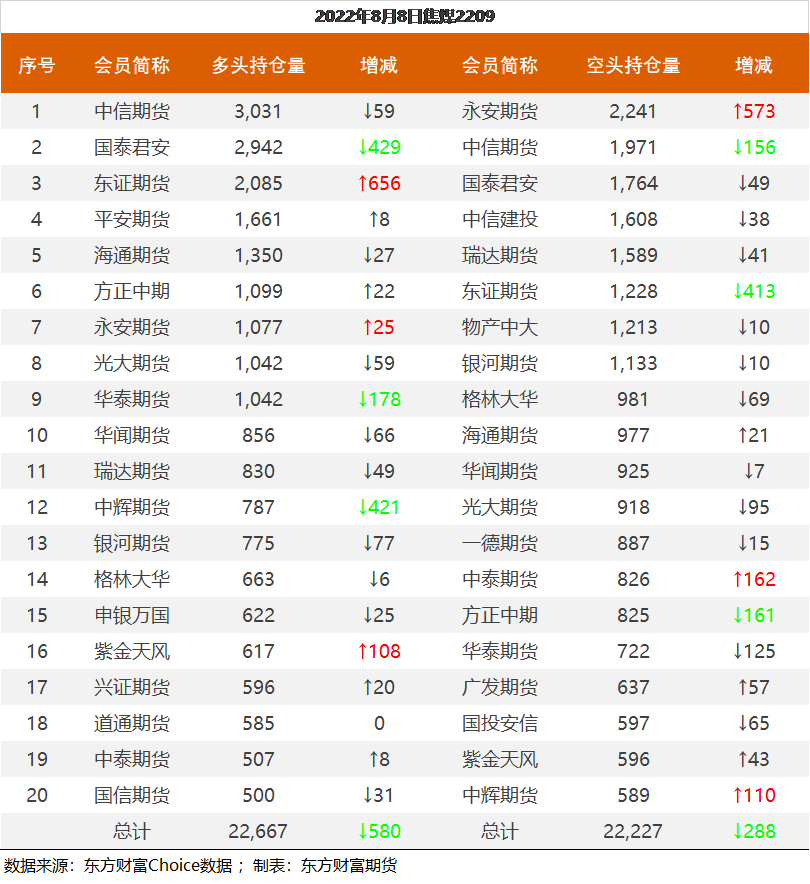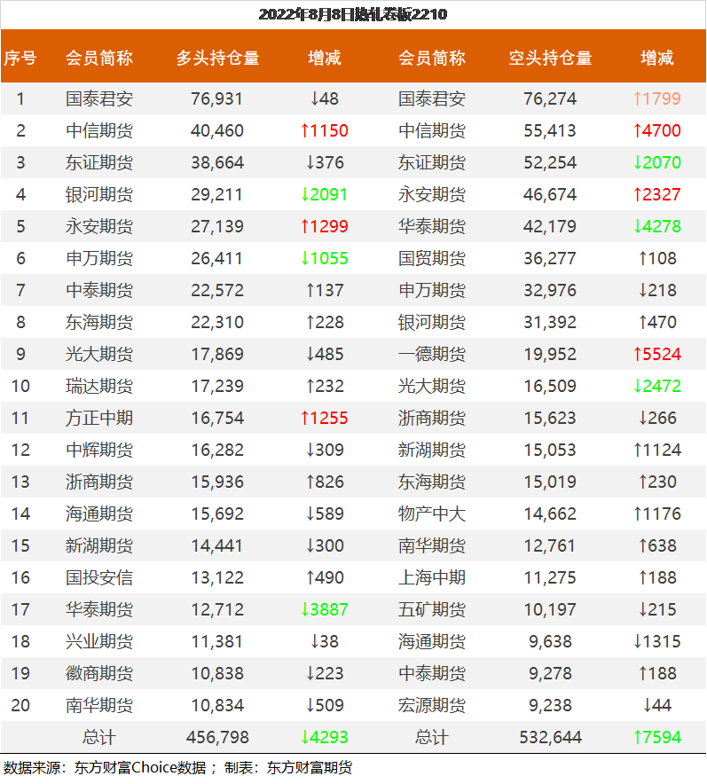 | 截至8月5日收盘,螺纹钢2210收4136元/吨,涨2.83%;热卷2210收4099元/吨,涨2.73%;铁矿石2209收737.5元/吨,涨4.31%;焦炭2209收2940.5元/吨,涨1.75%;焦煤2209收2183元/吨,涨1.96%。 螺纹钢2210合约前20席位多单减仓14784手至103.9万手,空单减仓15780手至108.5万手,整体净空45223手。其中永安期货多单增持12423手,空单增持831手,整体净多55212手。 各品种具体如下: ![]() 各品种持仓情况具体如下: ![]() ![]() ![]() ![]() ![]() (文章来源:东方财富研究中心) (责任编辑:admin) |