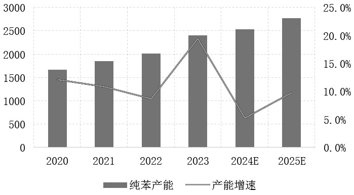 2024年苯乙烯先扬后抑,整体维持高位运行,2025年供需格局及纯苯端驱动有何变化?本文将对苯乙烯相关指标进行梳理分析并给出展望。 纯苯去库偏慢 鉴于苯乙烯供需矛盾并不突出,原料端纯苯作为主要驱动之一影响较大。从纯苯产能发展看,2024年纯苯产能增速放缓至5.2%,纯苯产能达到2530万吨/年。展望2025年,纯苯计划新增产能预计超240万吨,多数为乙烯裂解副产。