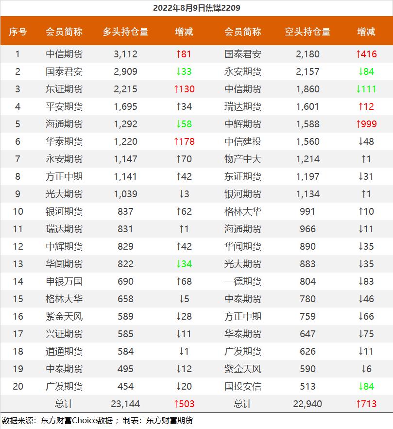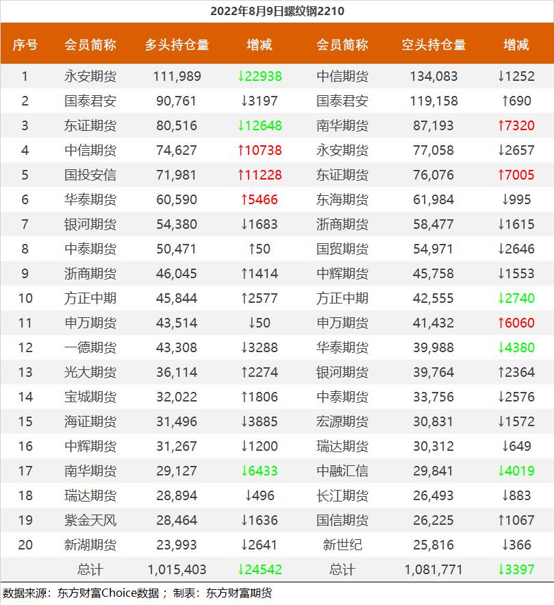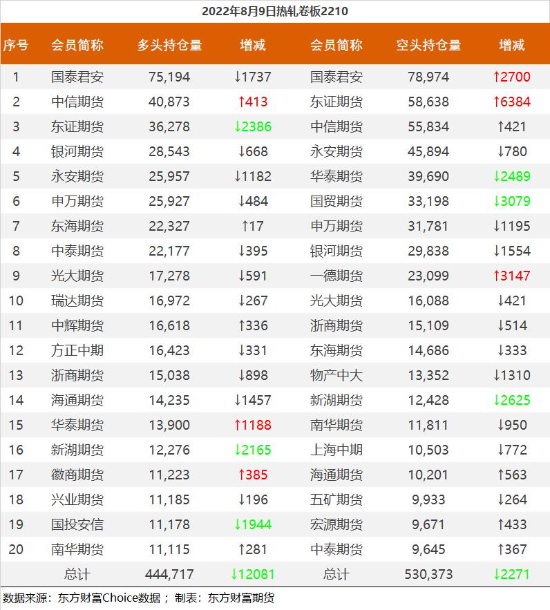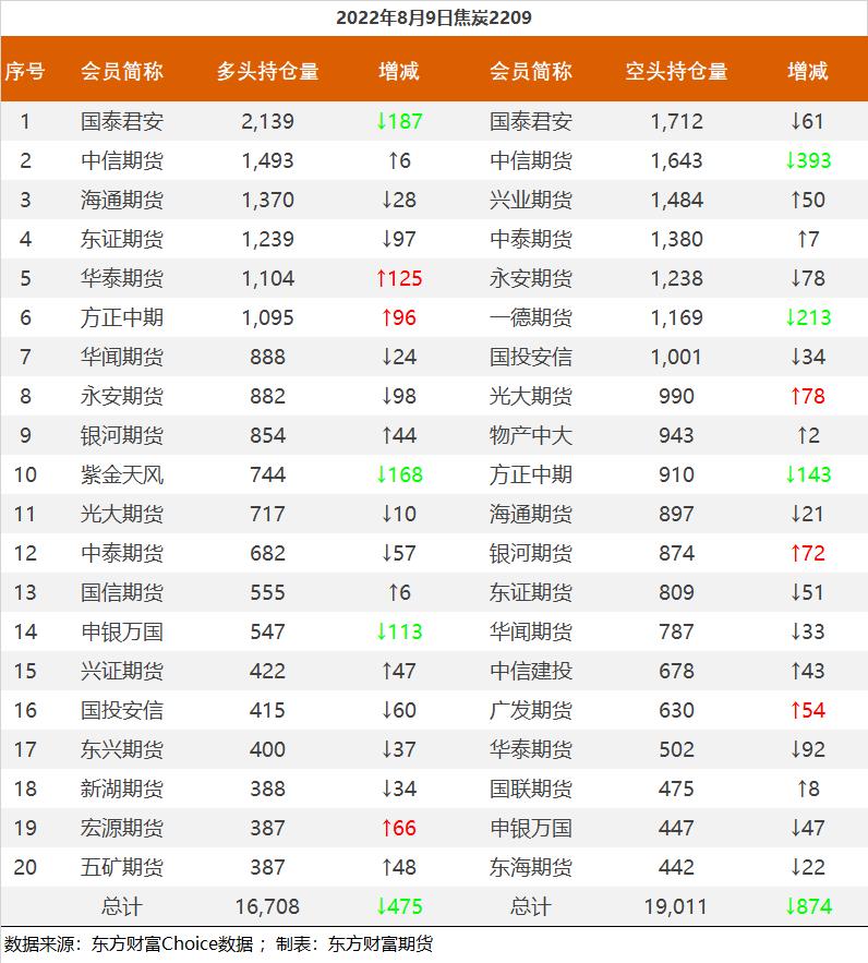 | 截至8月9日收盘,螺纹钢2210收4089元/吨,跌0.32%;热卷2210收4049元/吨,跌0.42%;铁矿石2301收723元/吨,跌1.36%;焦炭2209收2960元/吨,涨2.16%;焦煤2209收2182元/吨,涨1.65%。 螺纹钢2210合约前20席位多单减仓24542手至101.5万手,空单减仓3397手至108.1万手,整体净空66368手。其中永安期货多单减持22938手,空单减持2657手,整体净多34931手。 各品种具体如下: ![]() 各品种持仓情况具体如下: ![]() ![]() ![]() ![]() ![]() (文章来源:东方财富研究中心) (责任编辑:admin) |