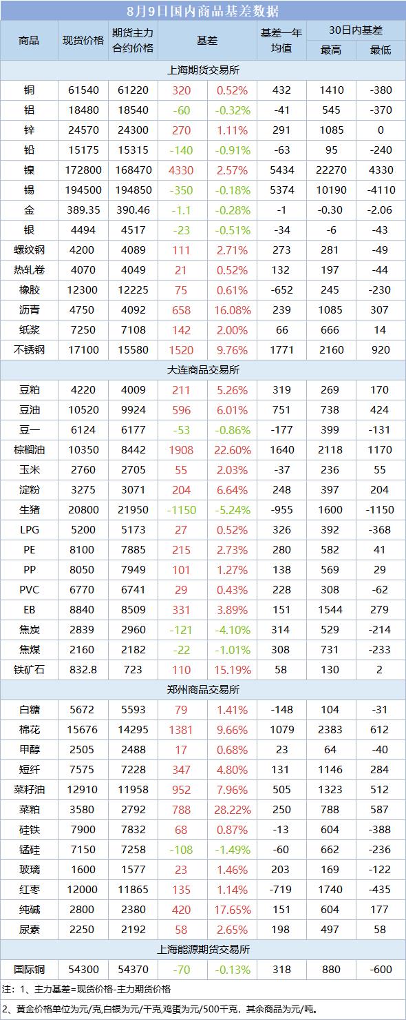 基差报告:8月9日国内商品基差数据一览