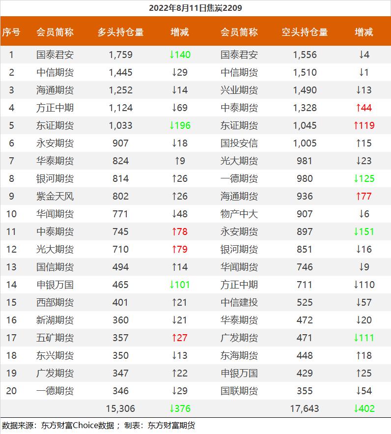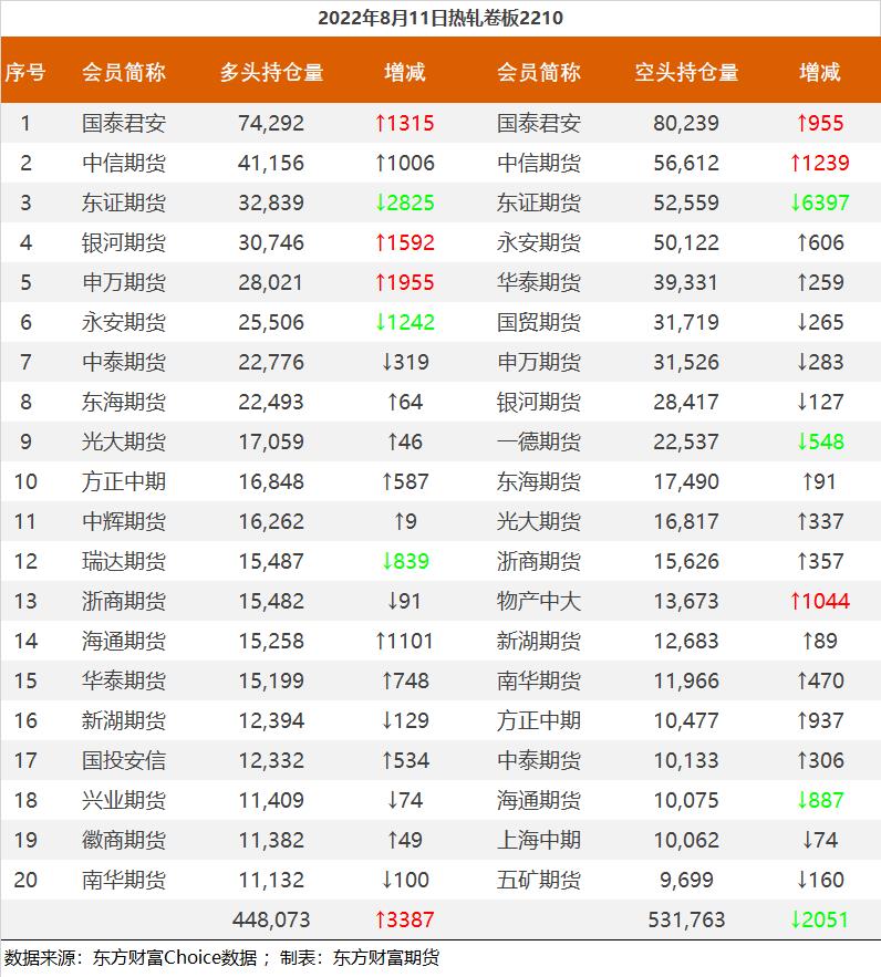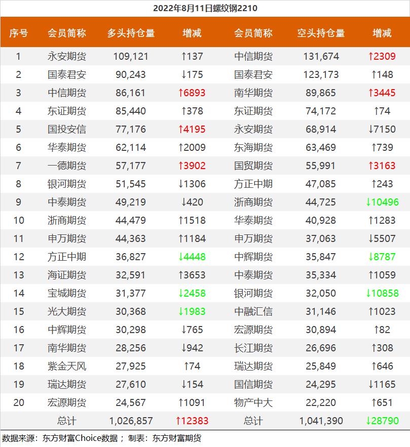 | 截至8月11日收盘,螺纹钢2210收4108元/吨,涨0.66%;热卷2210收4056元/吨,涨0.57%;铁矿石2301收741元/吨,涨2.28%;焦炭2209收2897元/吨,跌0.82%;焦煤2209收2135元/吨,跌0.28%。 螺纹钢2210合约前20席位多单增仓12383手至102.6万余手,空单减仓28790手至104.1万余手,整体净空14533手。其中永安期货多单增持137手,空单减持7150手,整体净多40207手;中信期货多单增持6893手,空单增持2309手,整体净空45513手。 各品种具体如下: ![]() 各品种持仓情况具体如下: ![]() ![]() ![]() ![]() ![]() (文章来源:东方财富研究中心) (责任编辑:admin) |