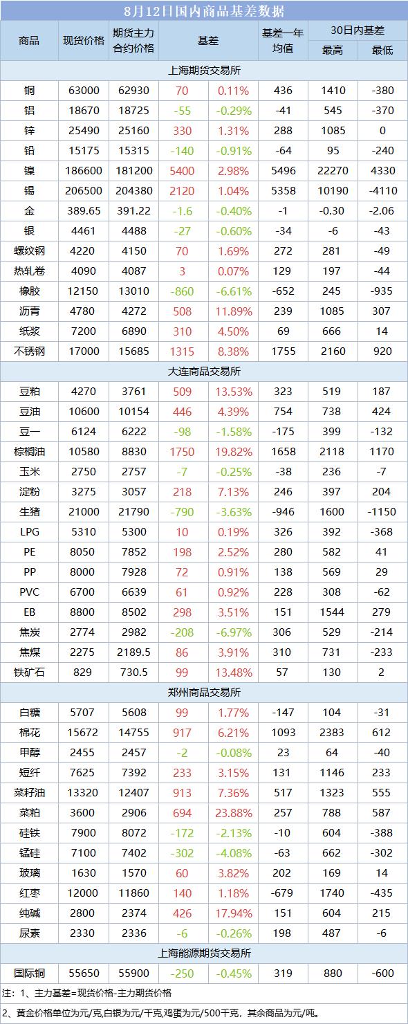 基差报告:8月12日国内商品基差数据一览